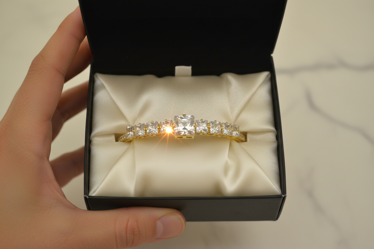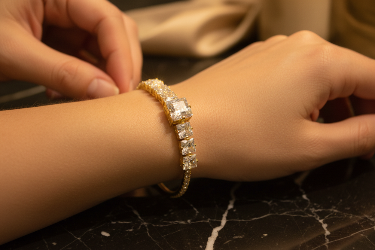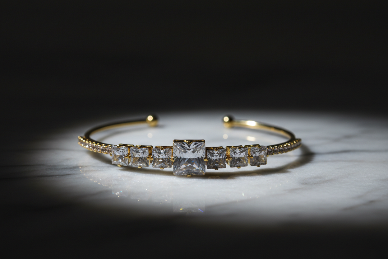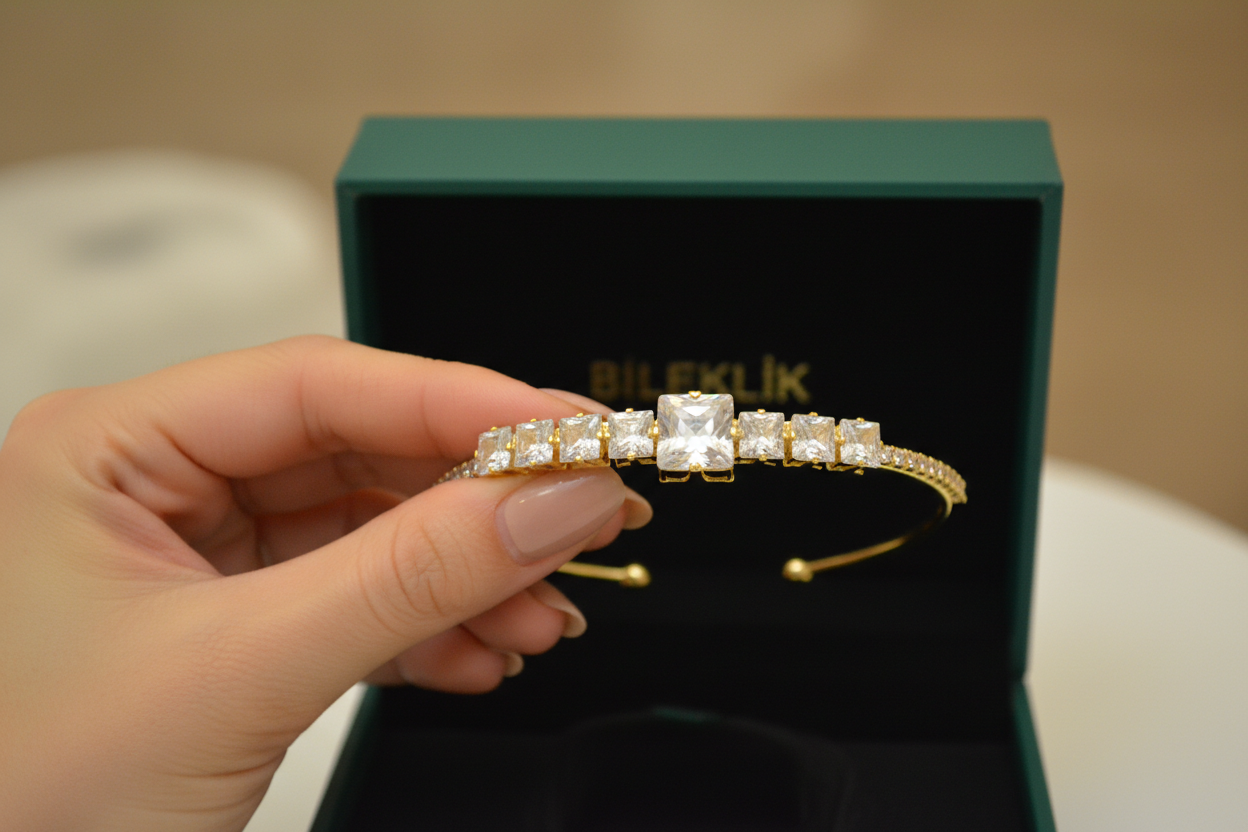 bileklik, minimal şıklığı güçlü bir ışıltıyla birleştirir. Açık uçlu ve
