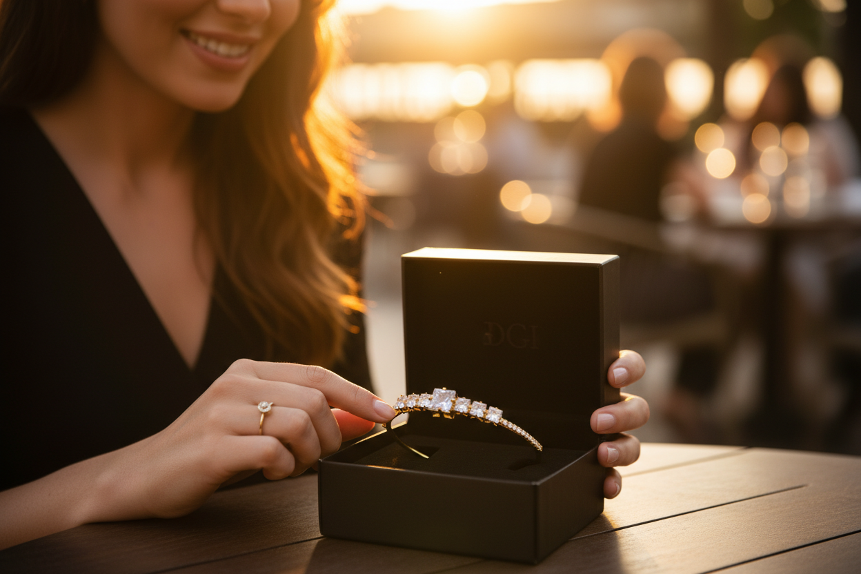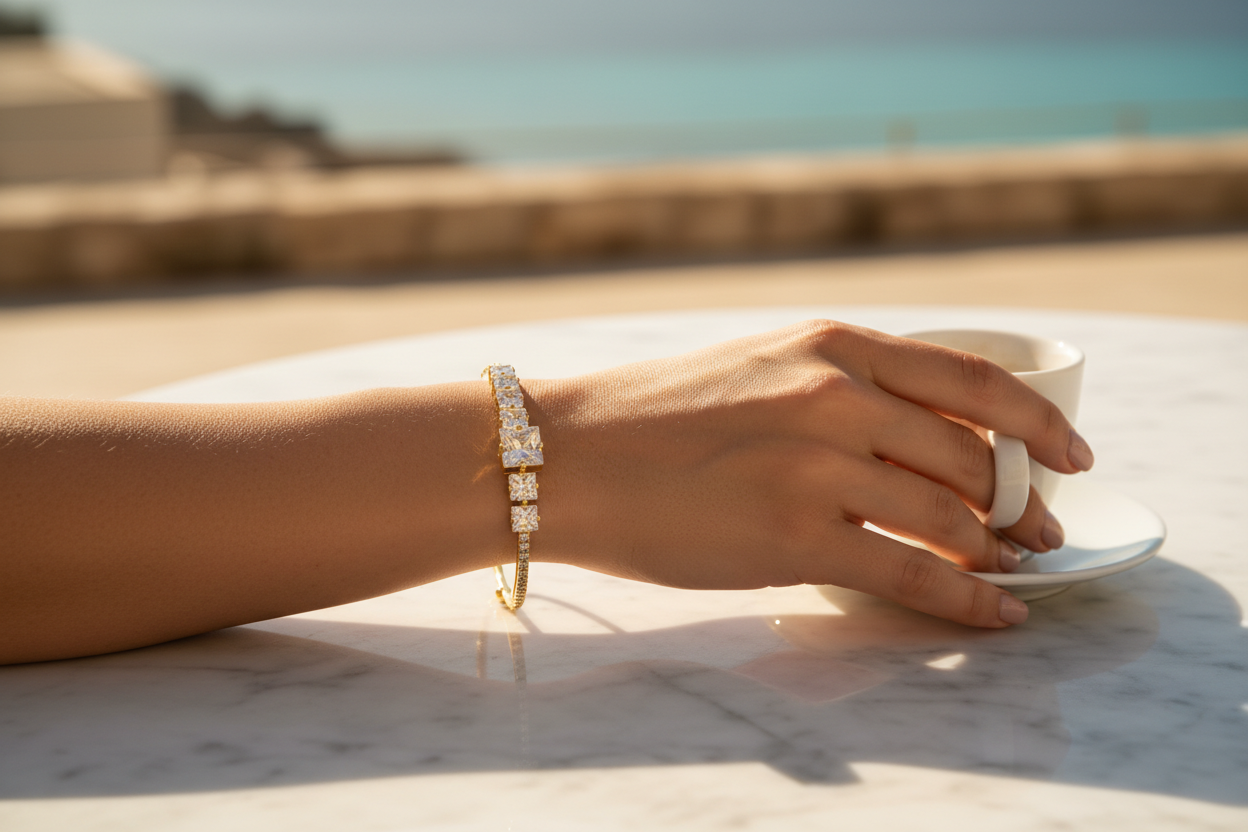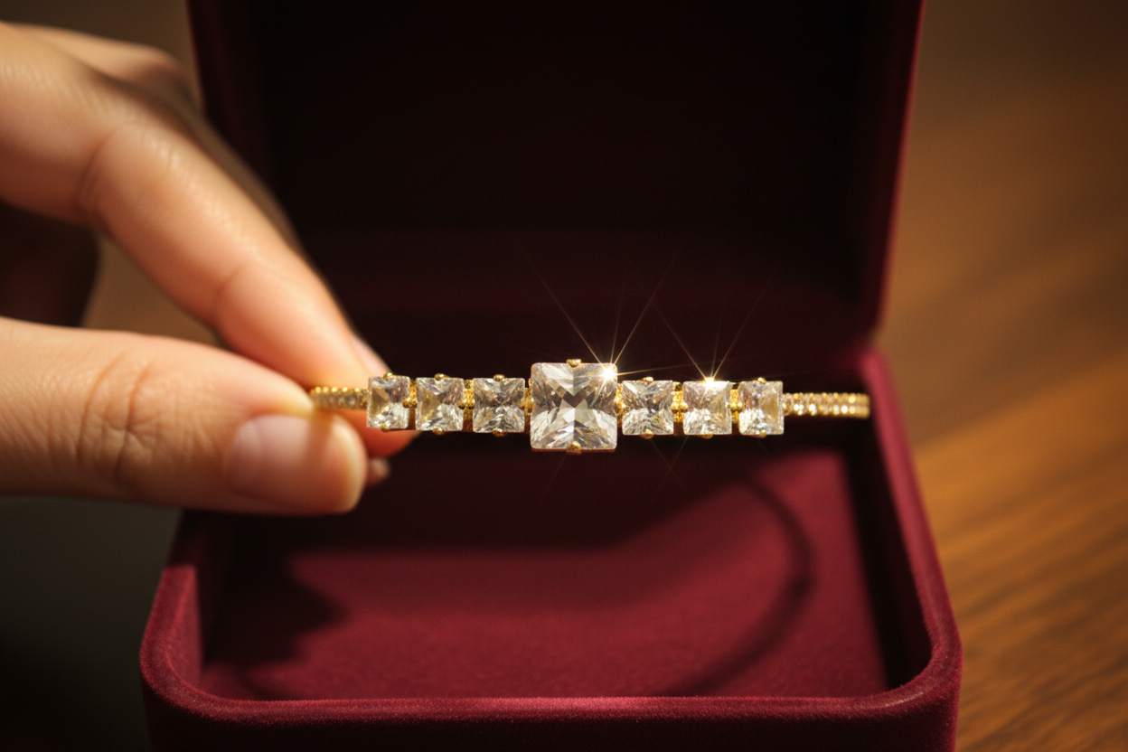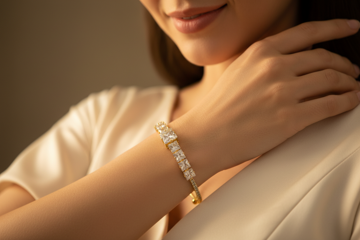 bileklik, minimal şıklığı güçlü bir ışıltıyla birleştirir. Açık uçlu ve