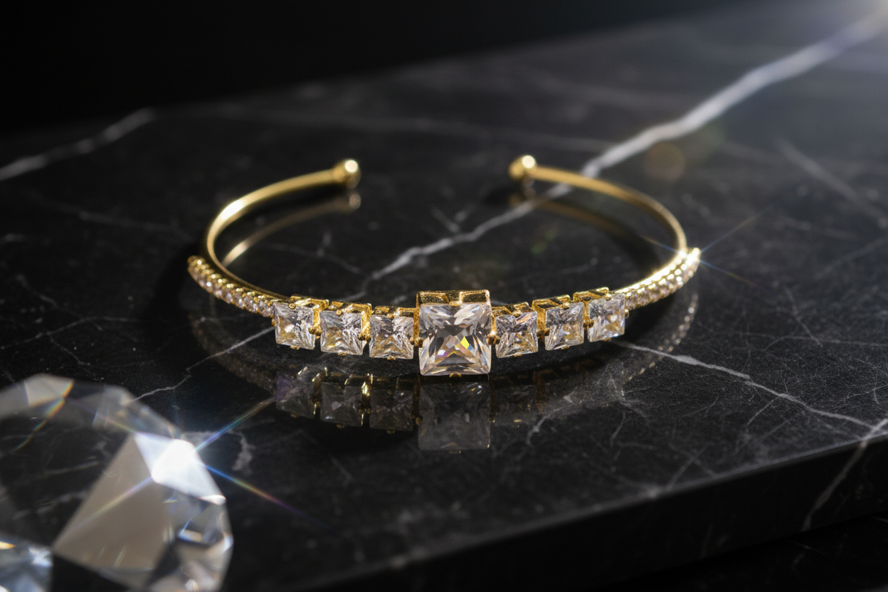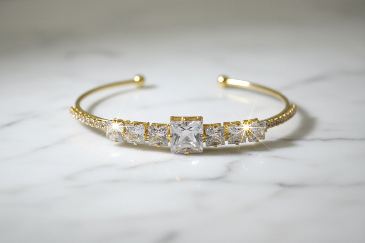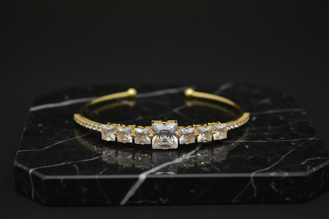 Gold kaplama metal, kare kesim zirkon taşlar, ayarlanabilir açık kelepçe yapı.