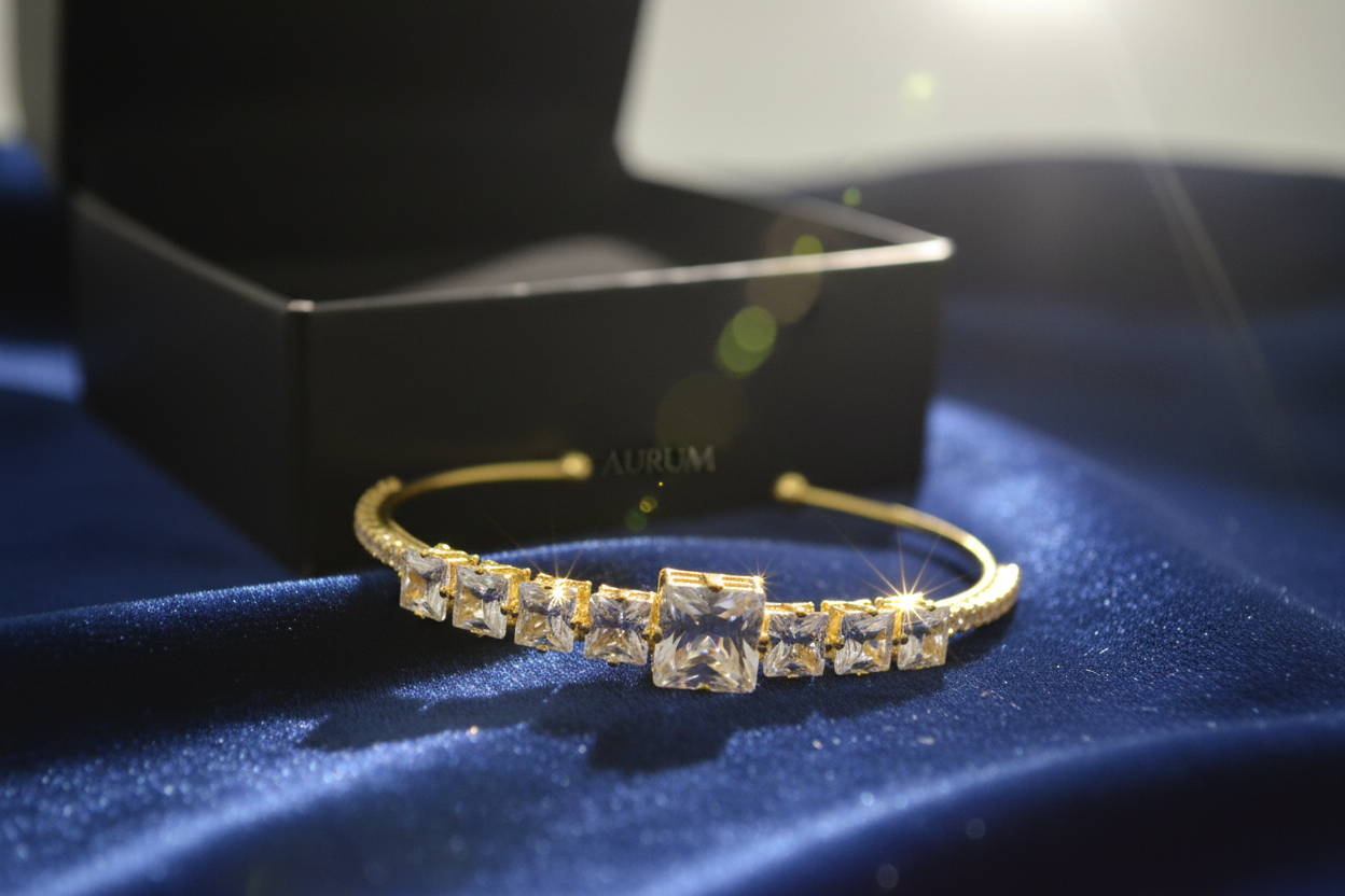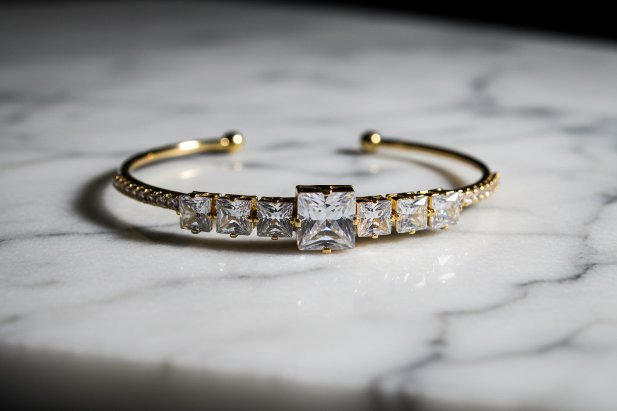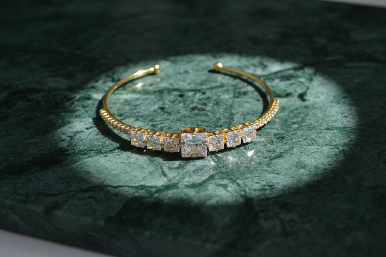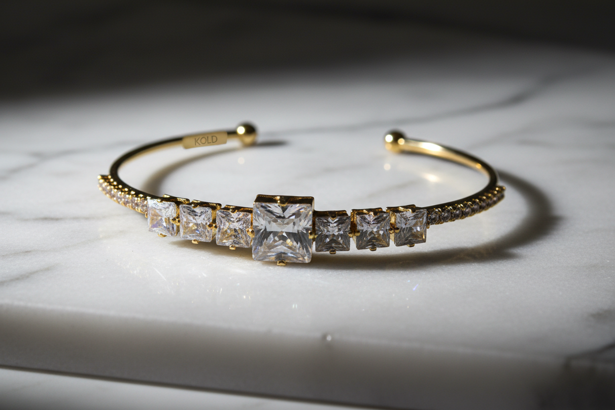 Gold kaplama metal, kare kesim zirkon taşlar, ayarlanabilir açık kelepçe yapı.