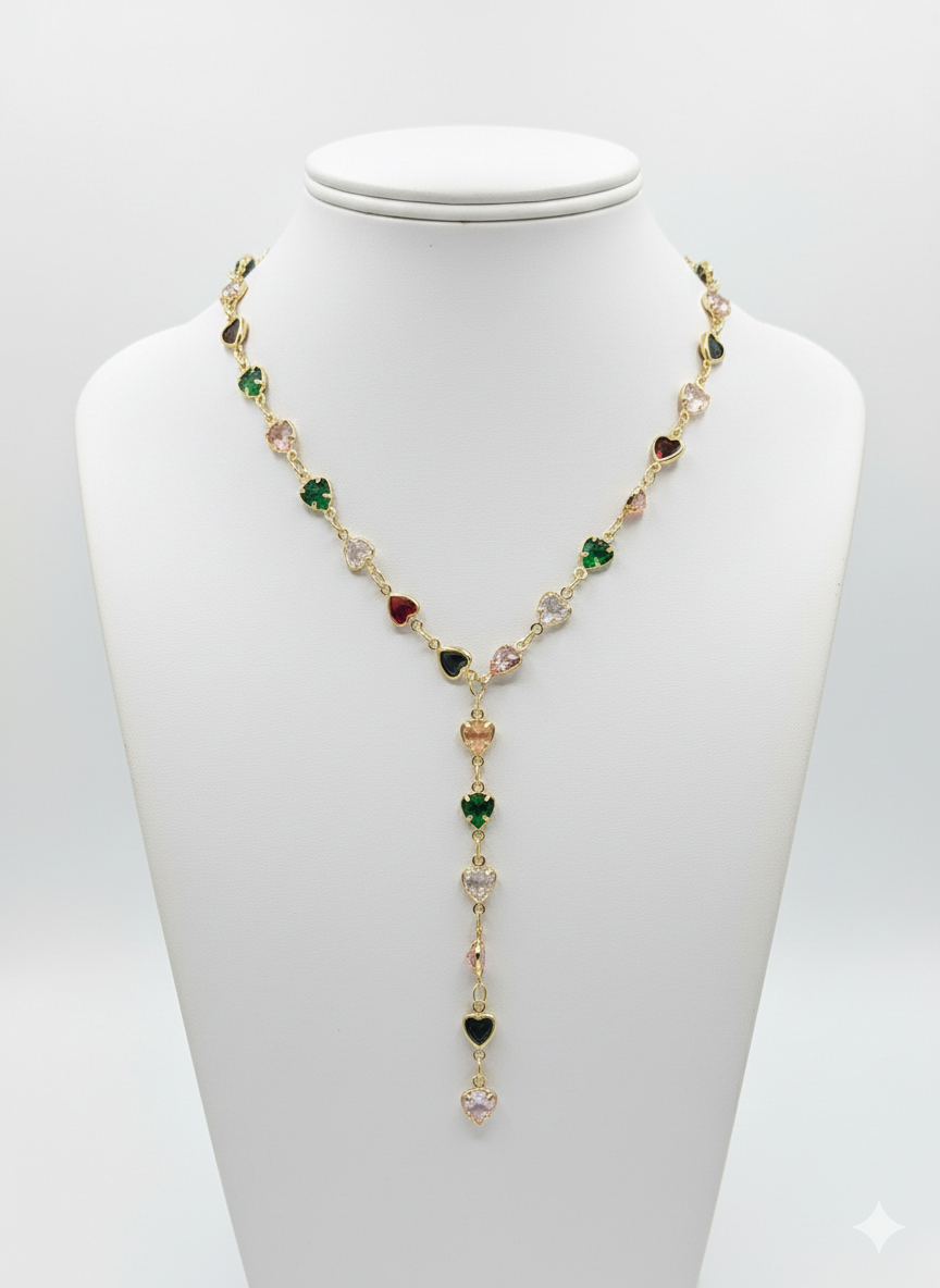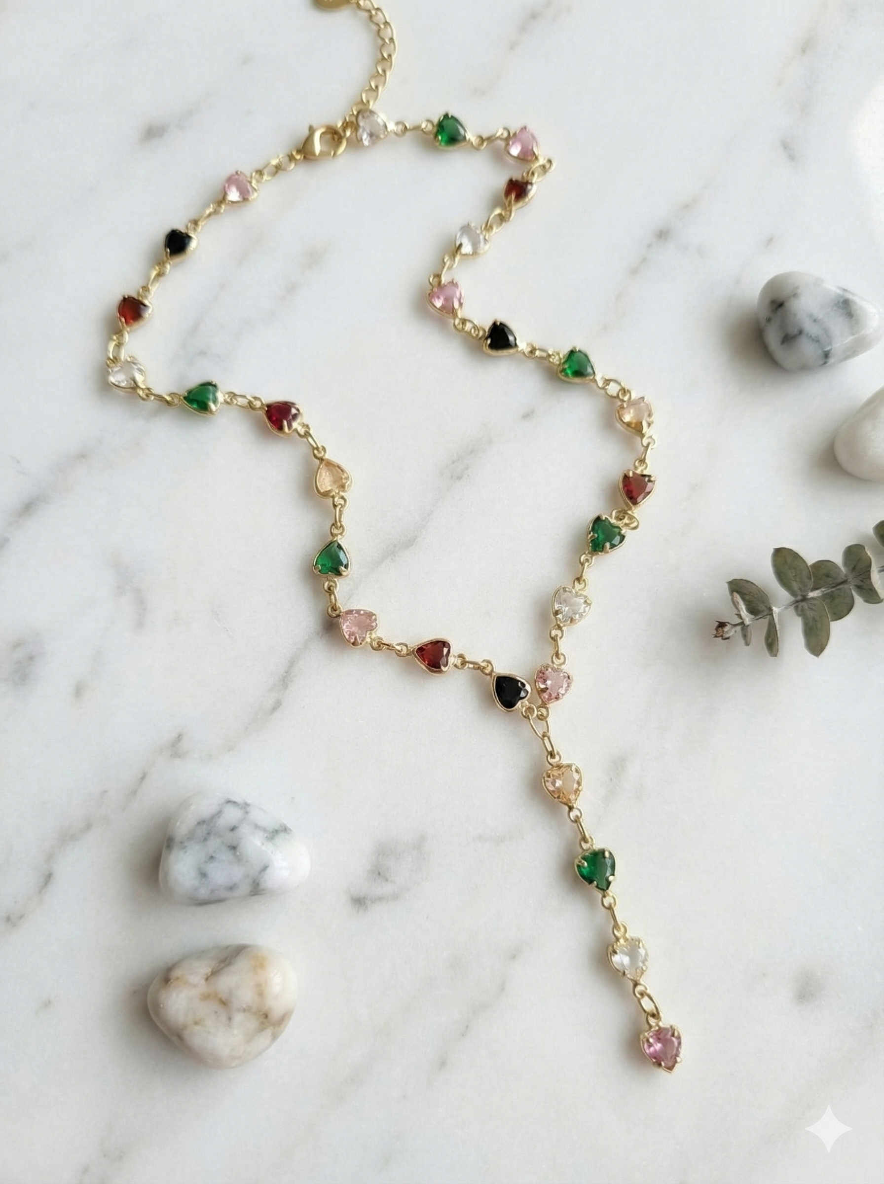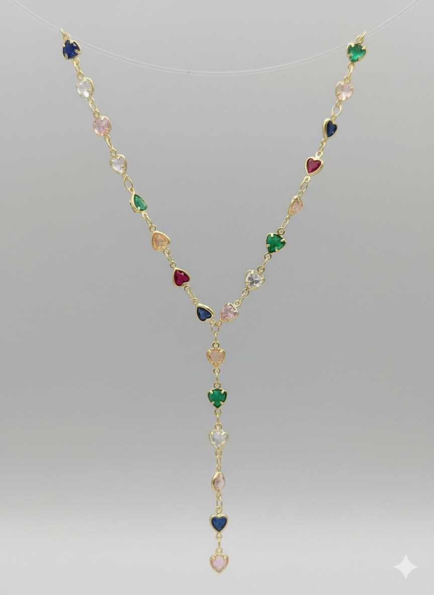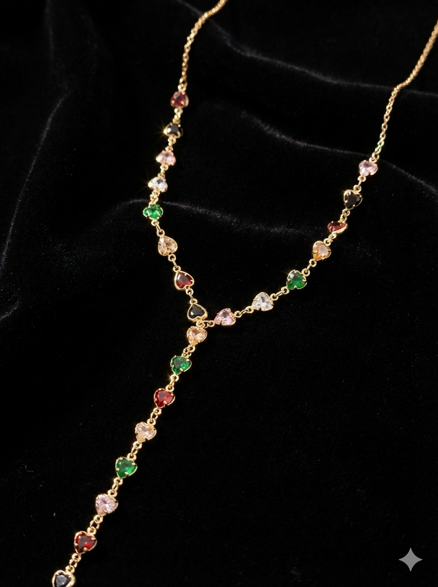 Y-shaped necklace features heart-cut multicolor stones set on a gold plated