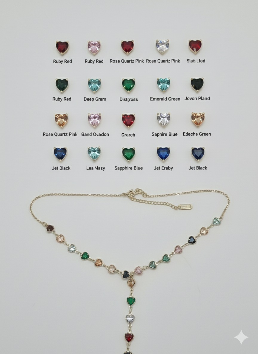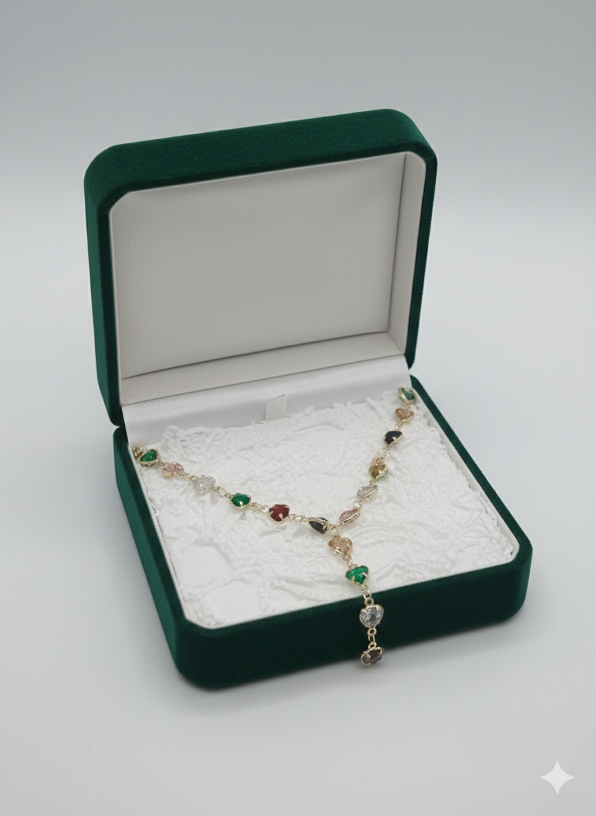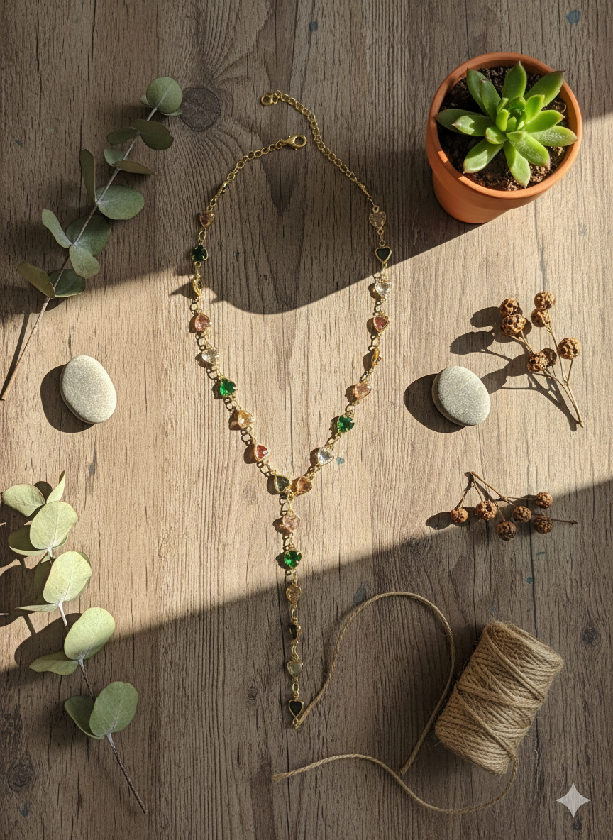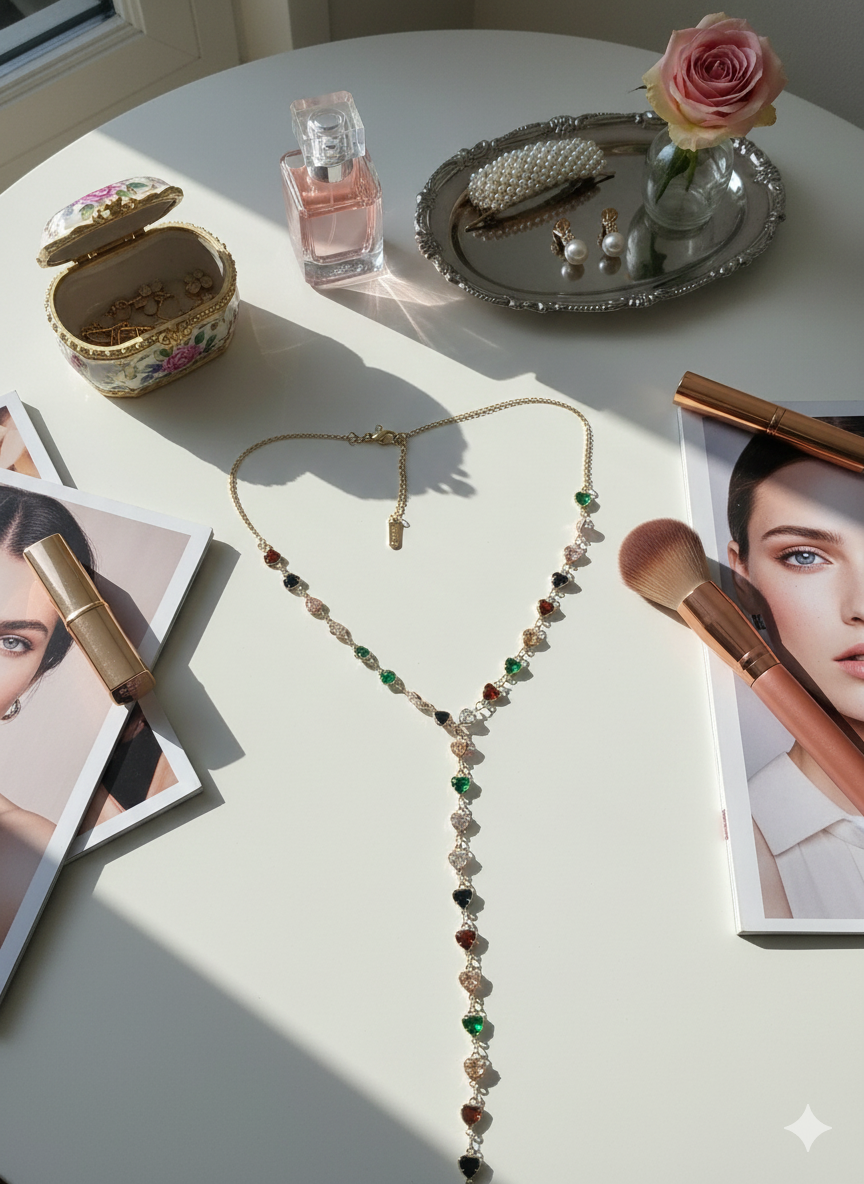Y-shaped necklace features heart-cut multicolor stones set on a gold plated