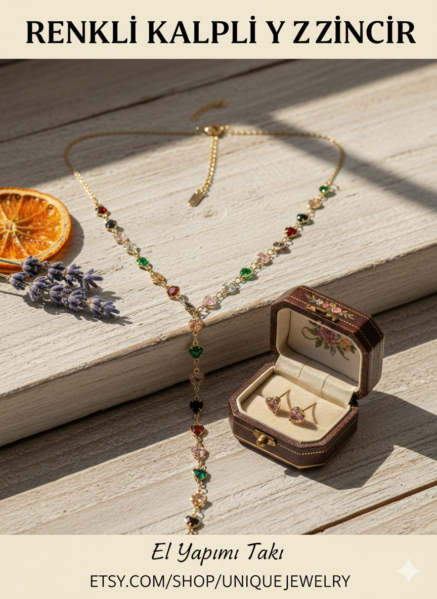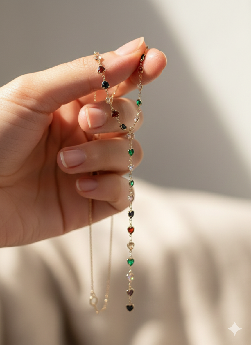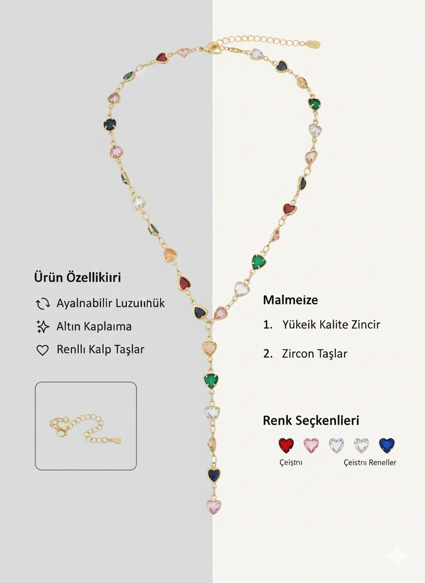 Altın kaplama alaşım zincir, cam/kristal görünümlü renkli kalp taşlar,