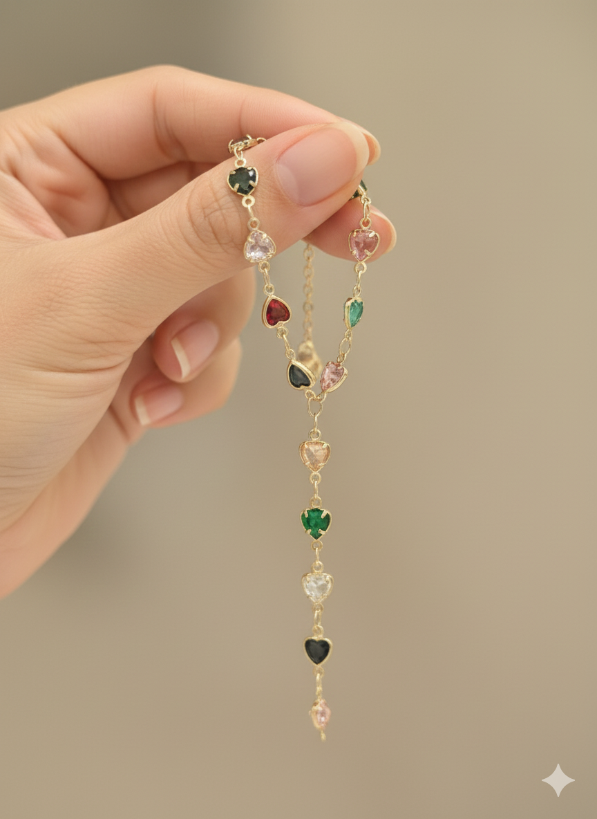 Gold plated alloy chain, multicolor glass/crystal-look heart stones, adjustable