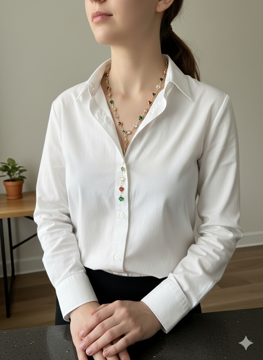 tasarımı ve kalp kesim renkli taş detaylarıyla öne çıkan bu kadın kolye, romantik