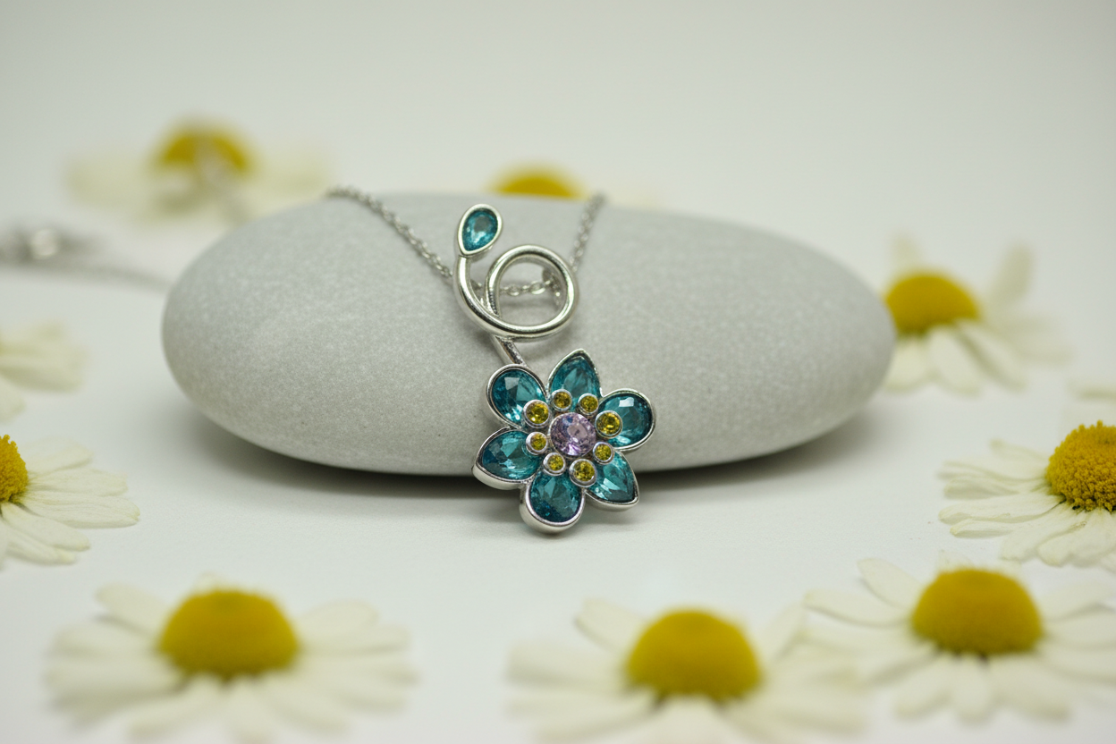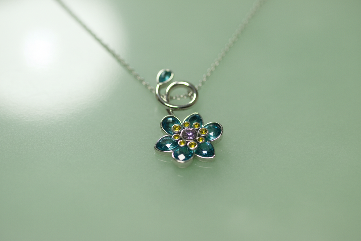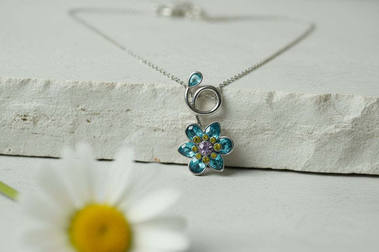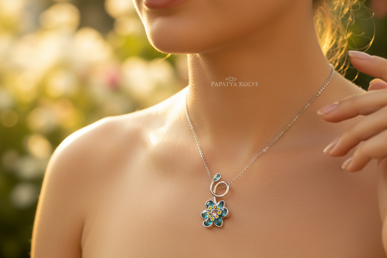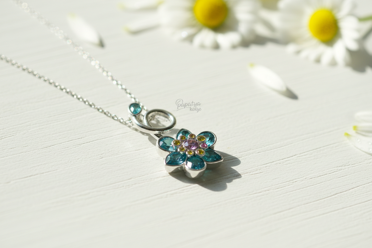 ilham alan bu zarif çiçek kolye, mavi ve yeşil tonlardaki taşların ışıltısıyla