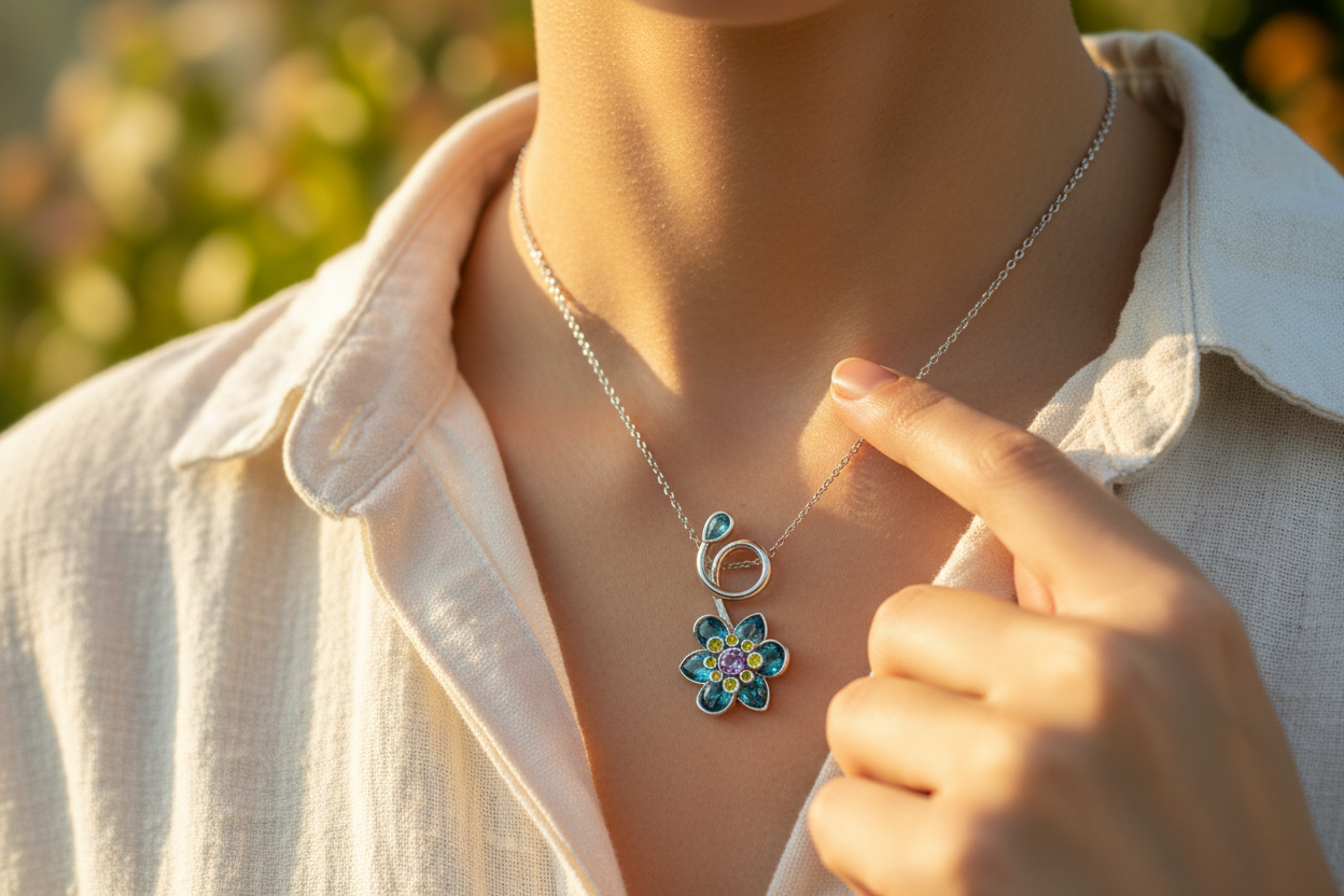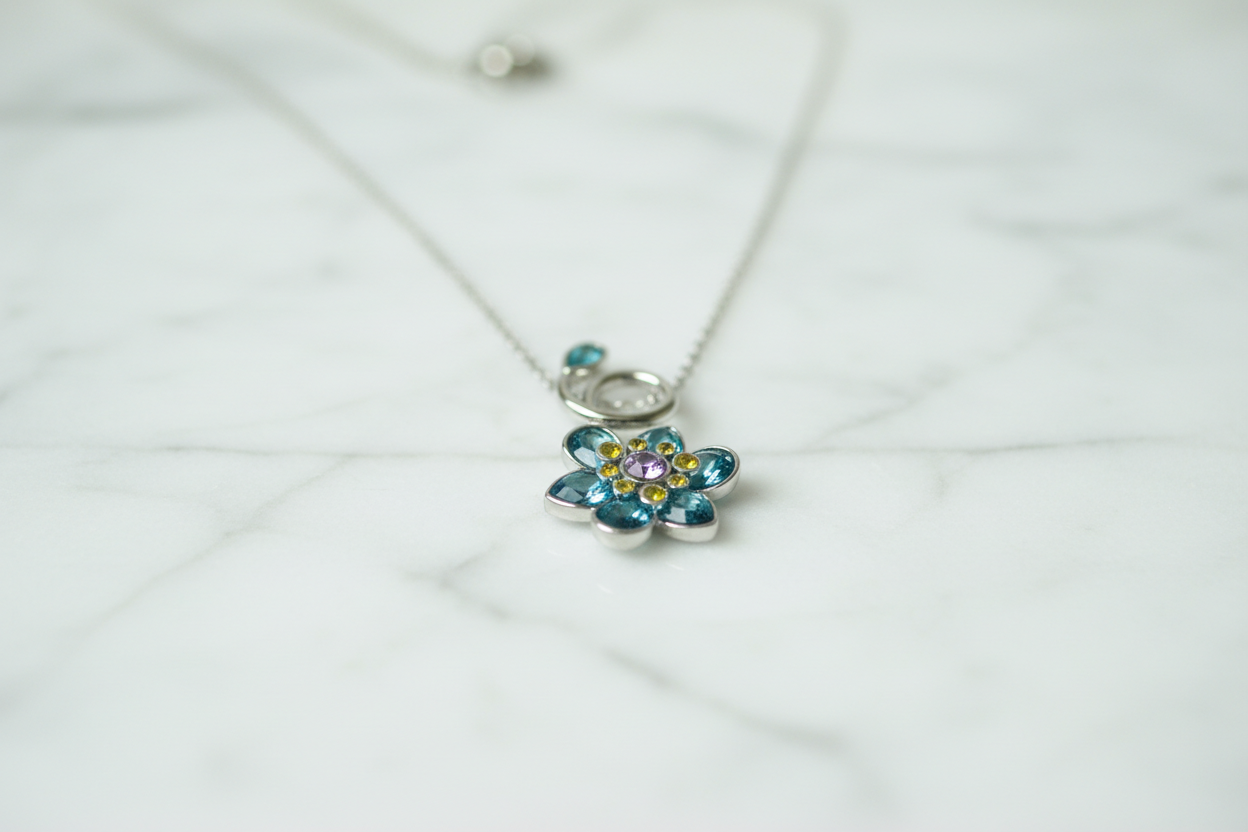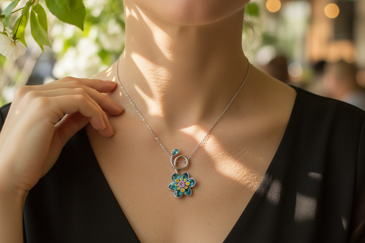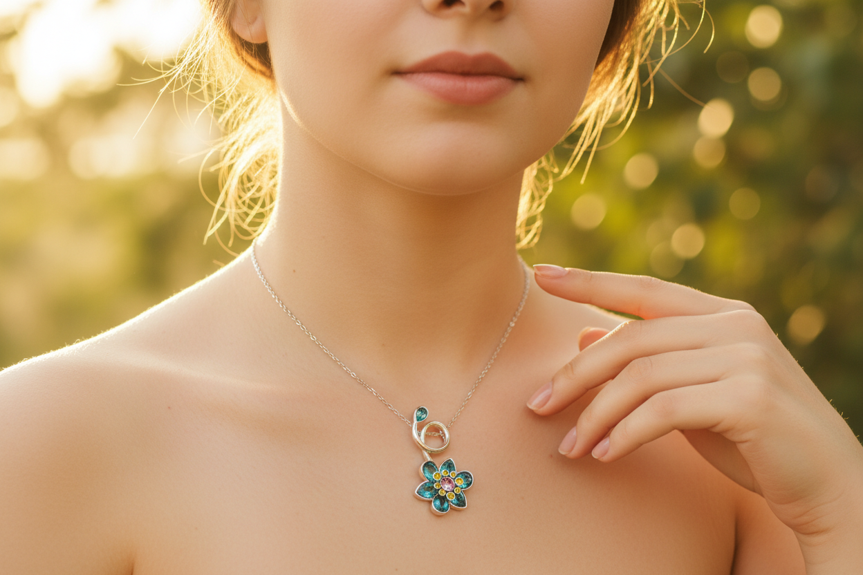 ilham alan bu zarif çiçek kolye, mavi ve yeşil tonlardaki taşların ışıltısıyla