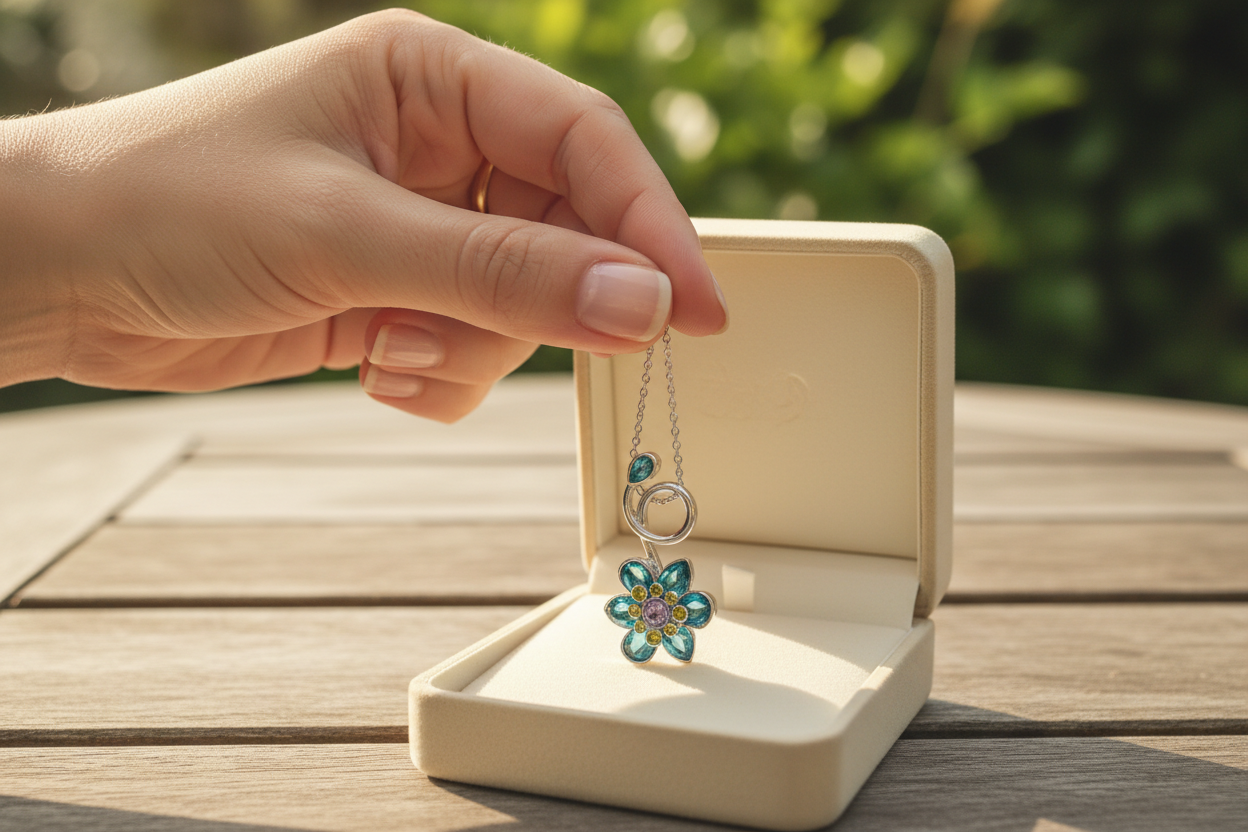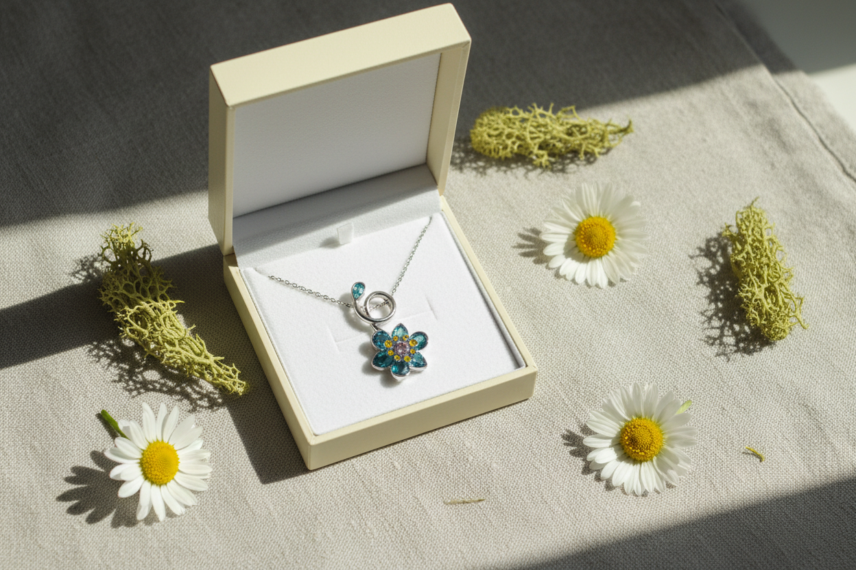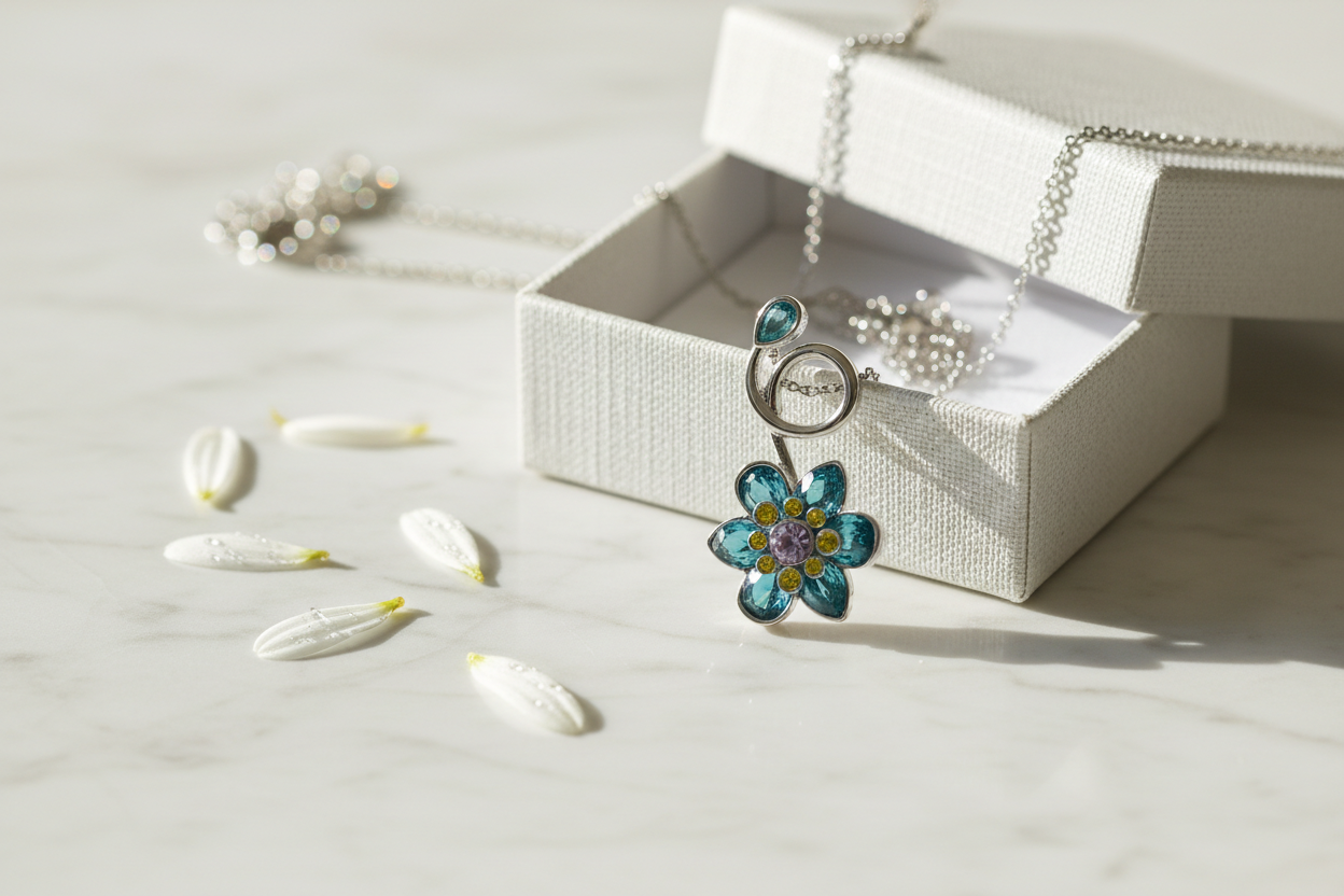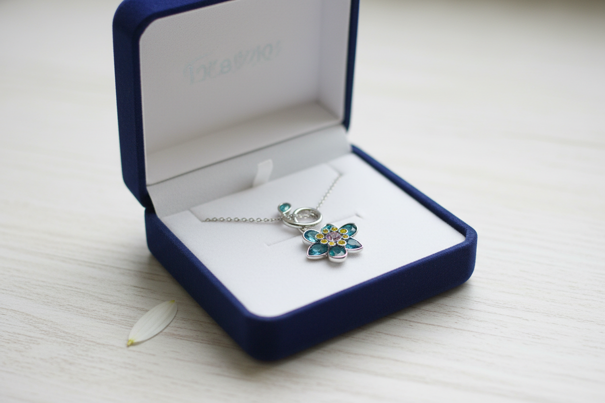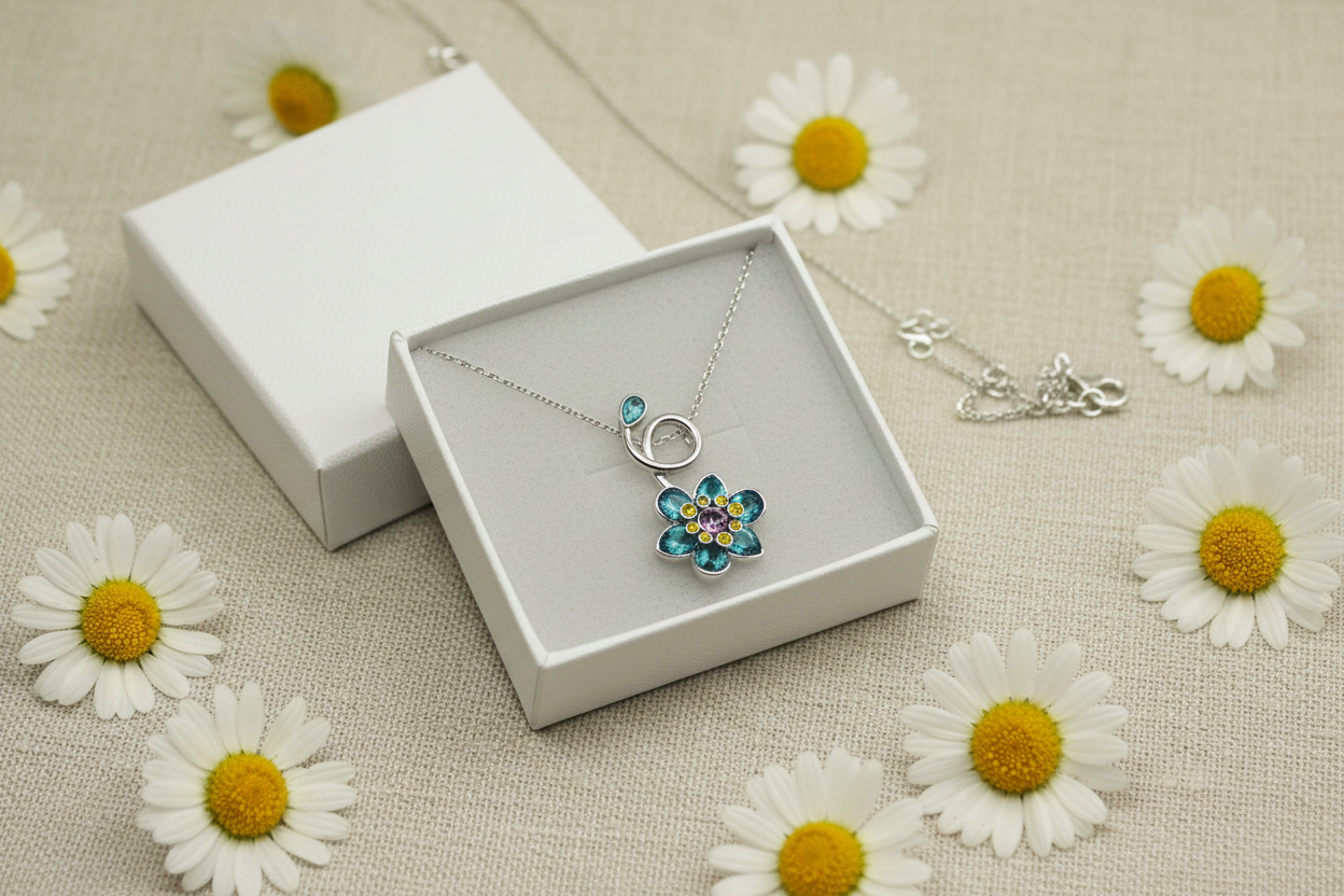 ilham alan bu zarif çiçek kolye, mavi ve yeşil tonlardaki taşların ışıltısıyla