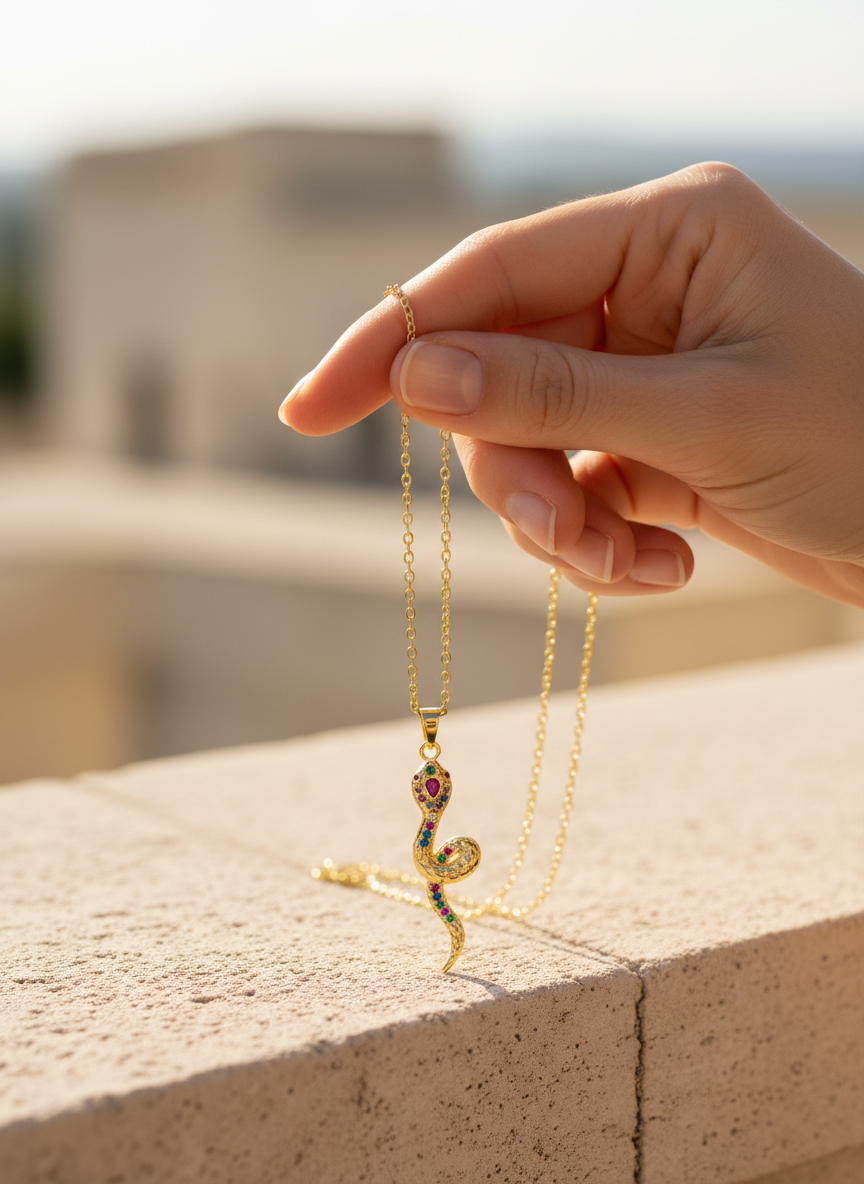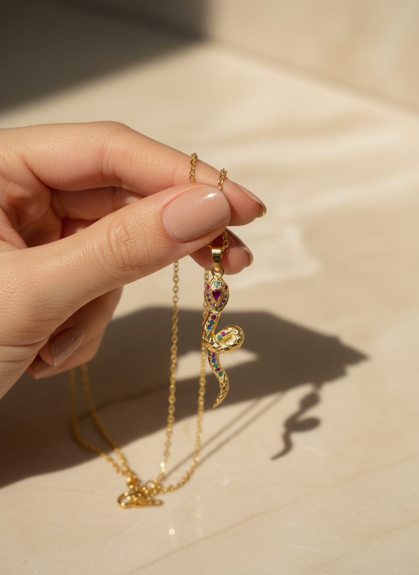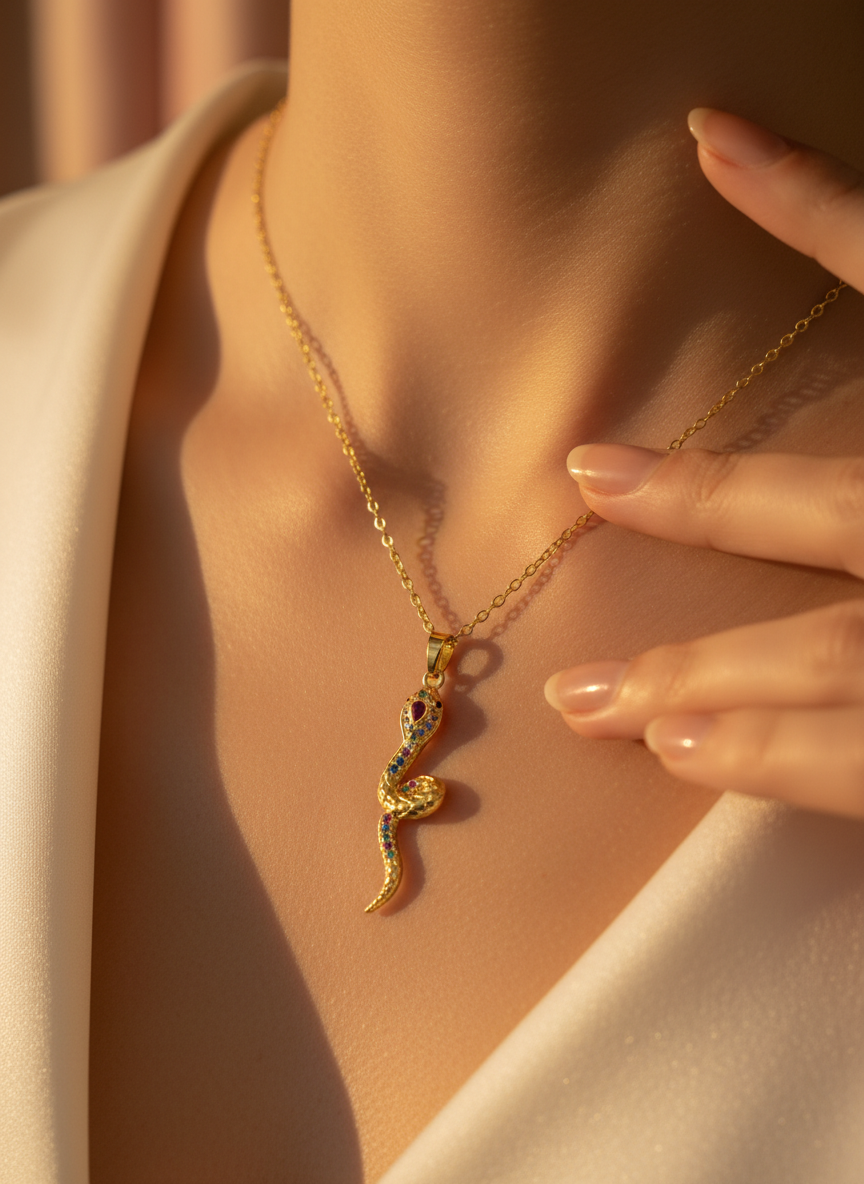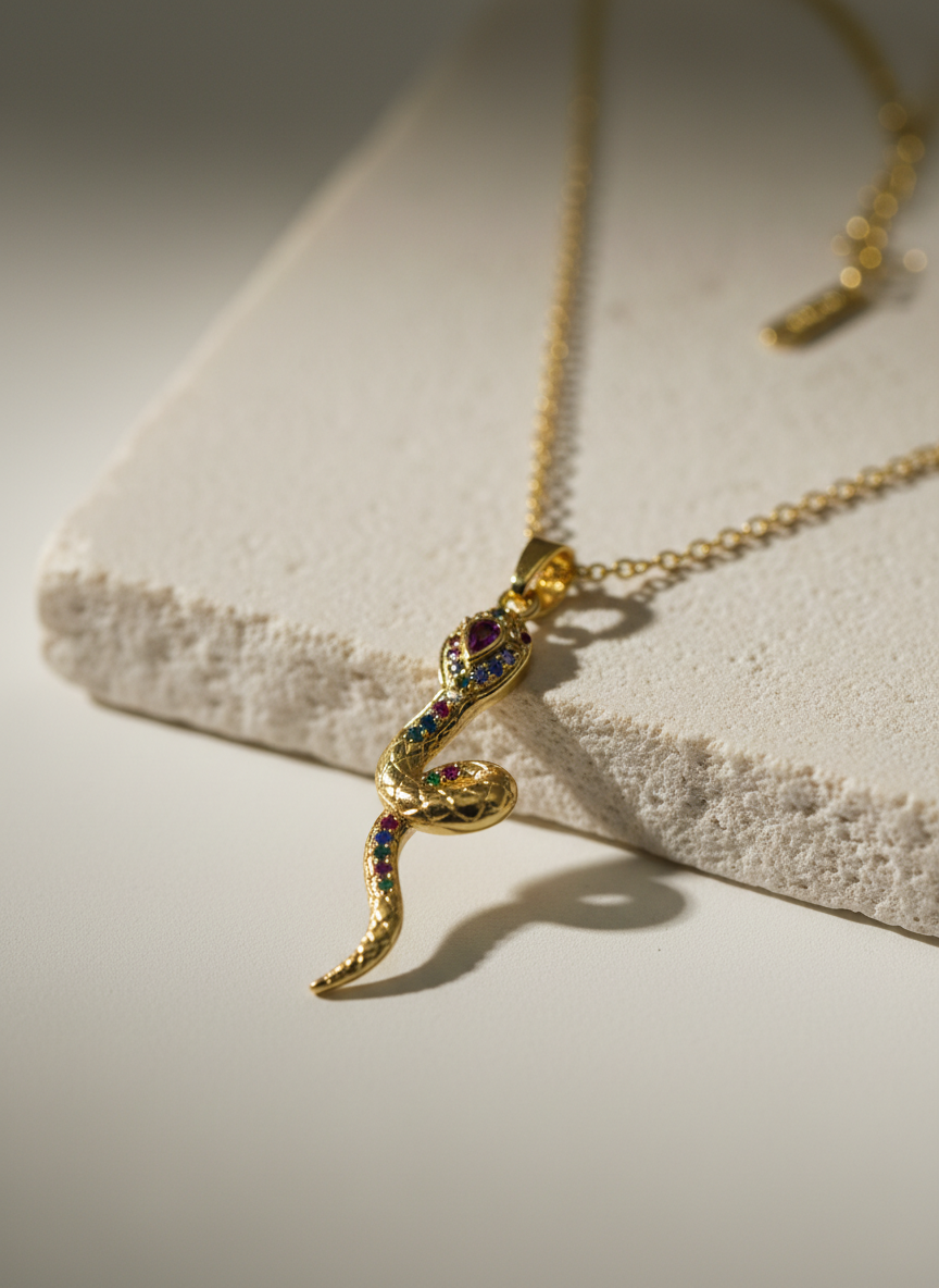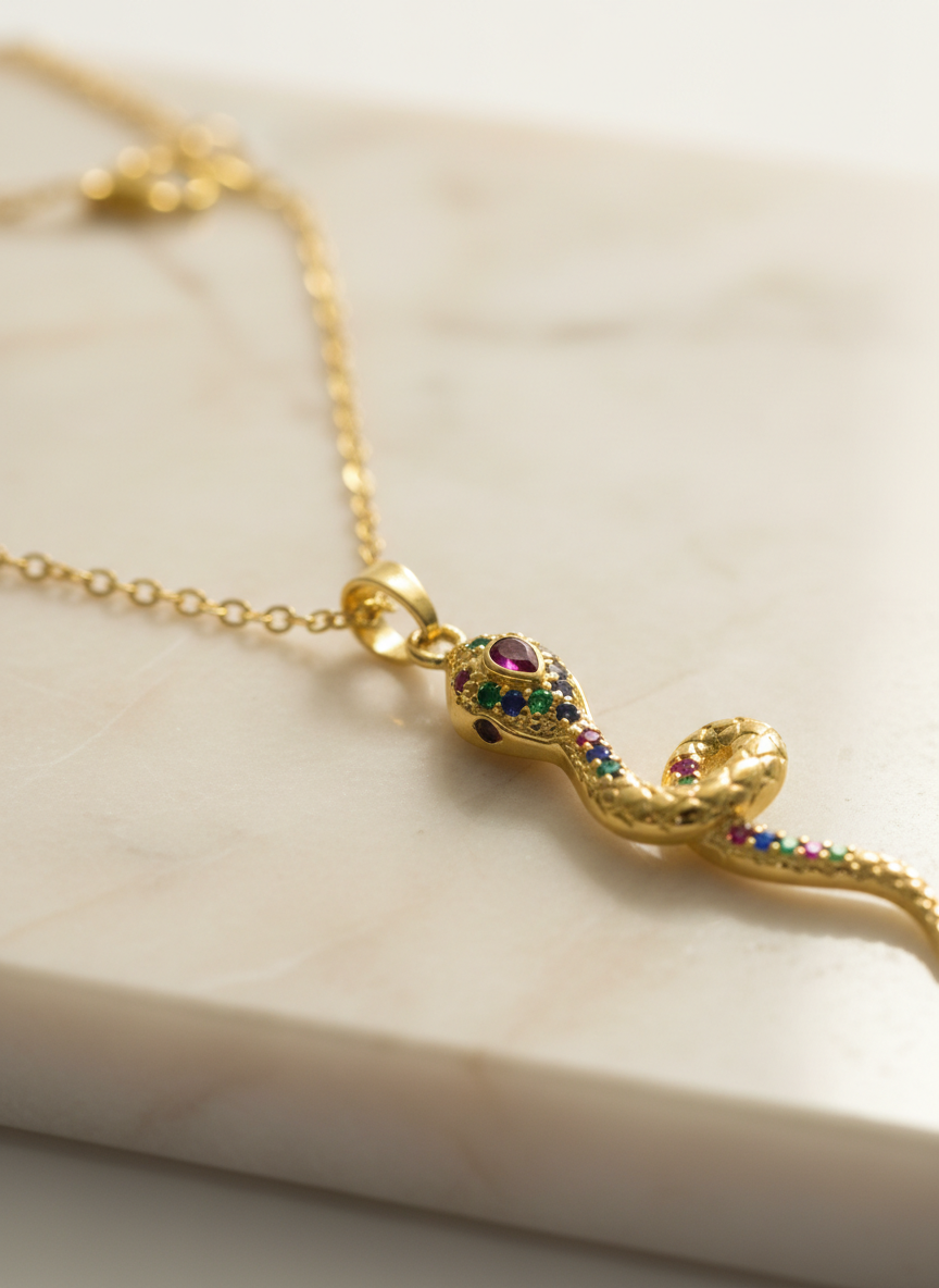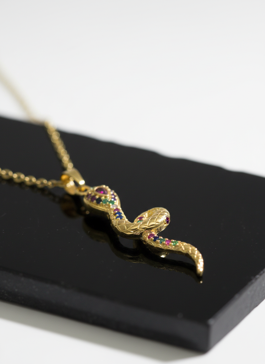 Yılan görüldü; güç, dönüşüm ve yenilenmenin evrensel sembolüdür. Altın rengin zarafeti ile buluşan bu özel kolye, renkli zirkon taş detaylarıyla göz alıcı bir şıklık sunar. Günlük kombinlere anlam katmak ya da sevdiklerinize güçlü bir mesaj içeren özel bir hediye vermek için tasarlandı. NIOR'un sembolik ve modern parlaklığını yansıtan bu kolye, stile gizemli bir dokunuş katar.