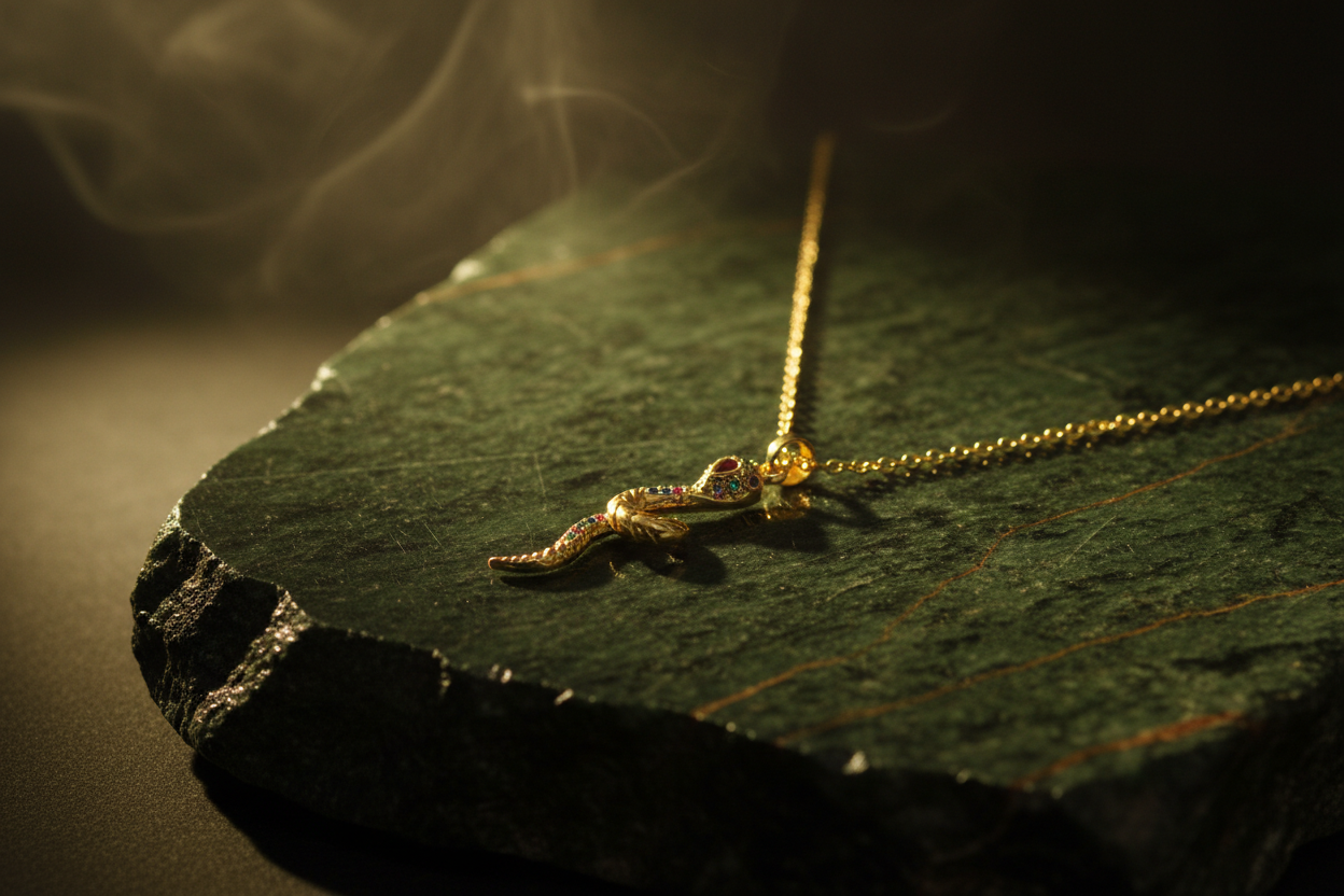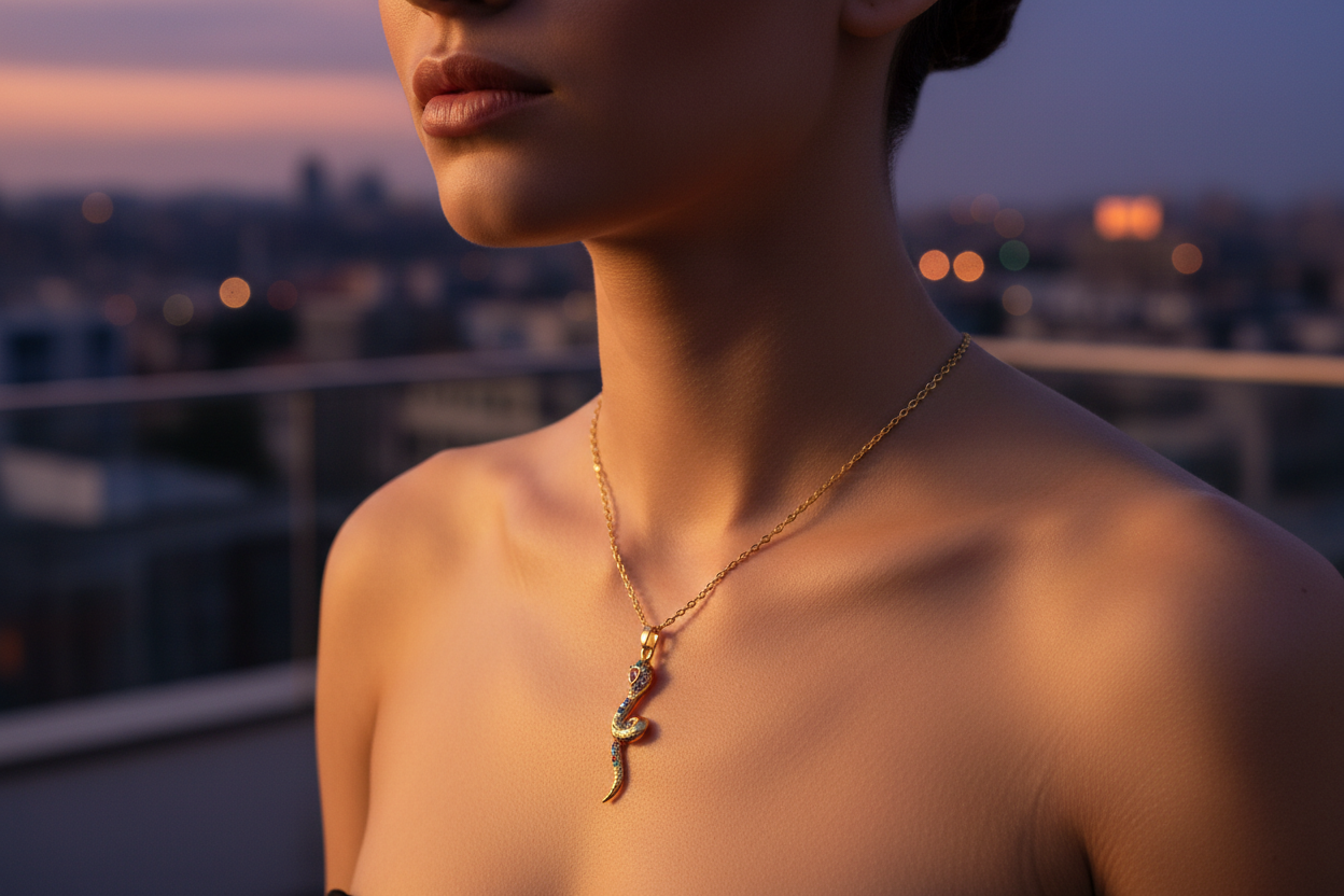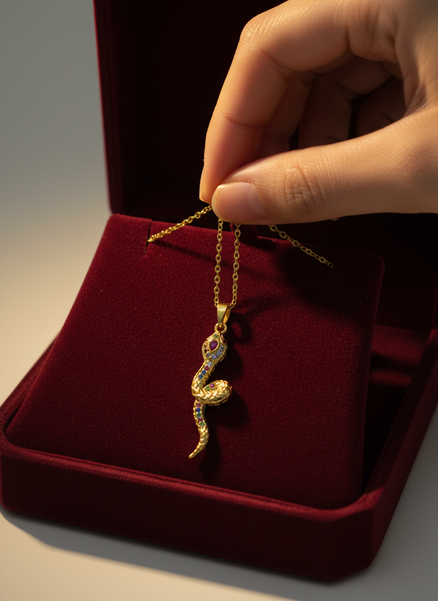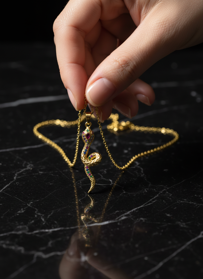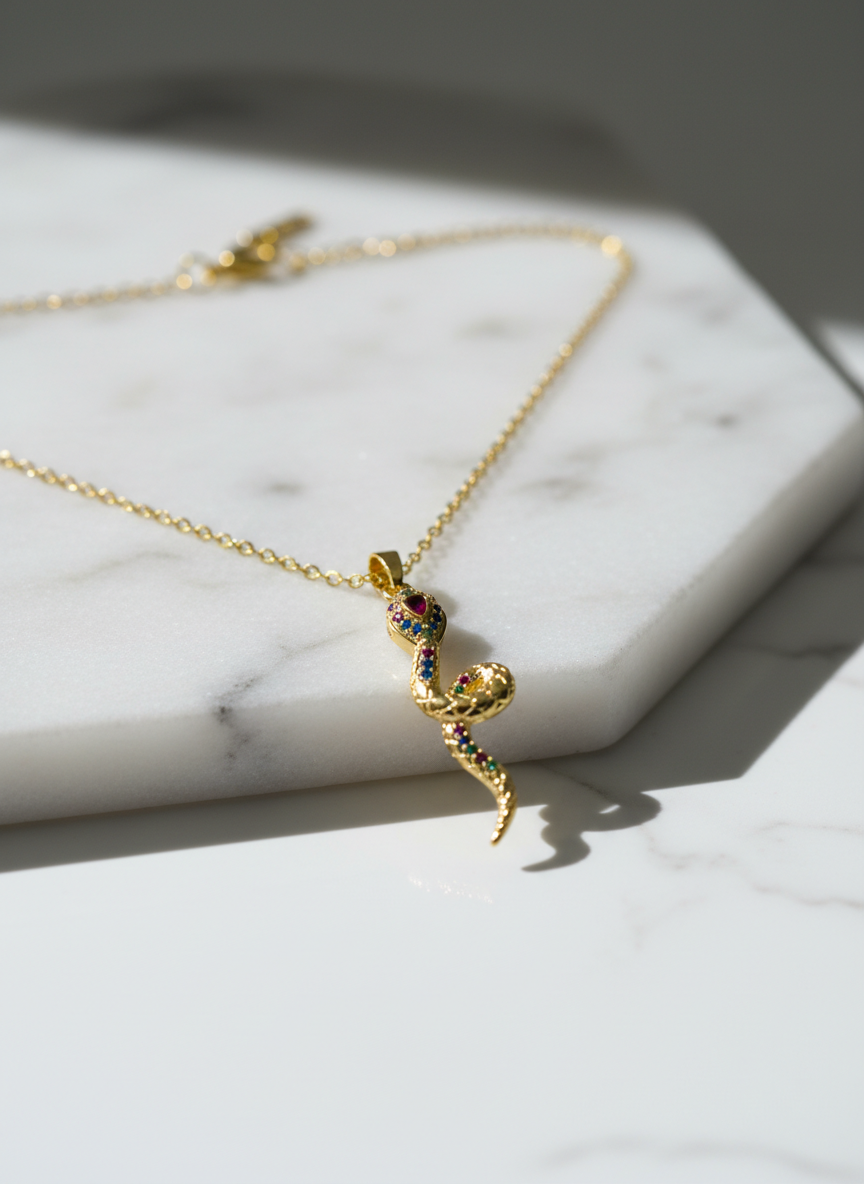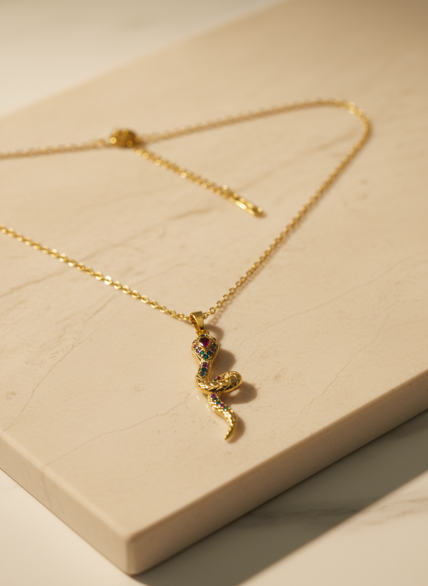 Yılan görüldü; güç, dönüşüm ve yenilenmenin evrensel sembolüdür. Altın rengin zarafeti ile buluşan bu özel kolye, renkli zirkon taş detaylarıyla göz alıcı bir şıklık sunar. Günlük kombinlere anlam katmak ya da sevdiklerinize güçlü bir mesaj içeren özel bir hediye vermek için tasarlandı. NIOR'un sembolik ve modern parlaklığını yansıtan bu kolye, stile gizemli bir dokunuş katar.