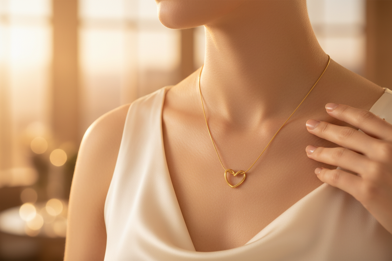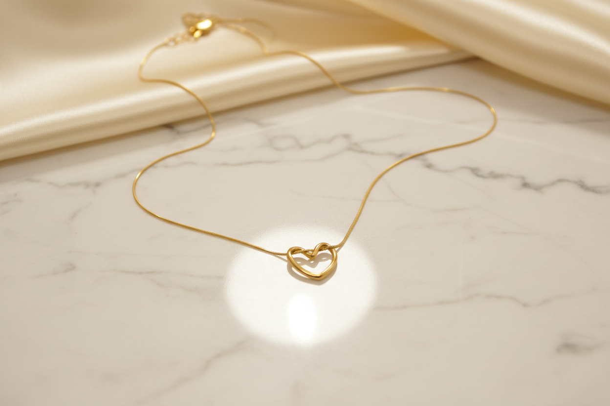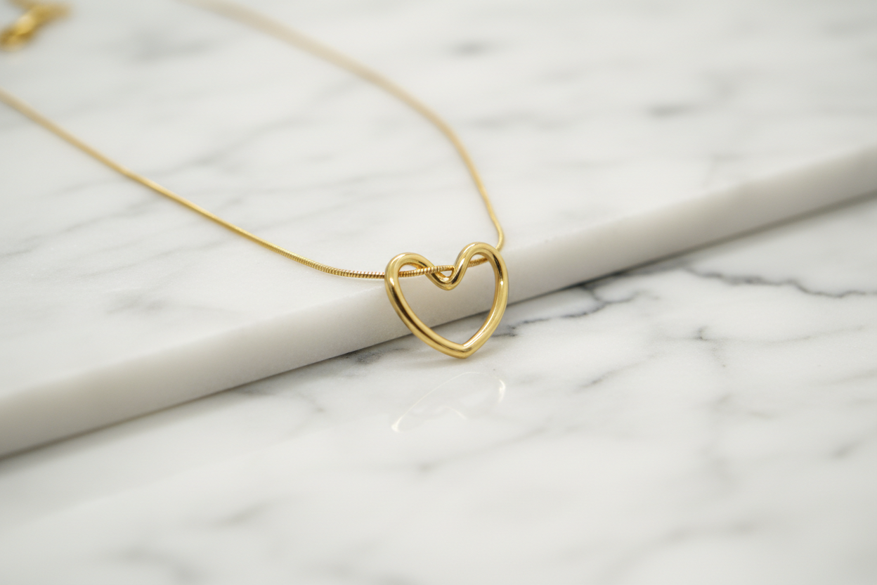 Altın renkli ince zinciri ve modern kalp formu sayesinde günlük kombinlerden