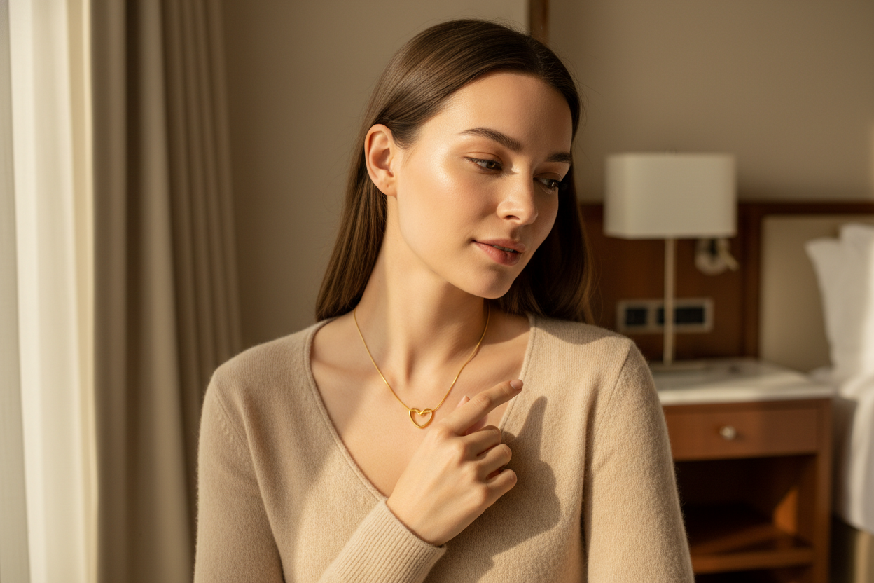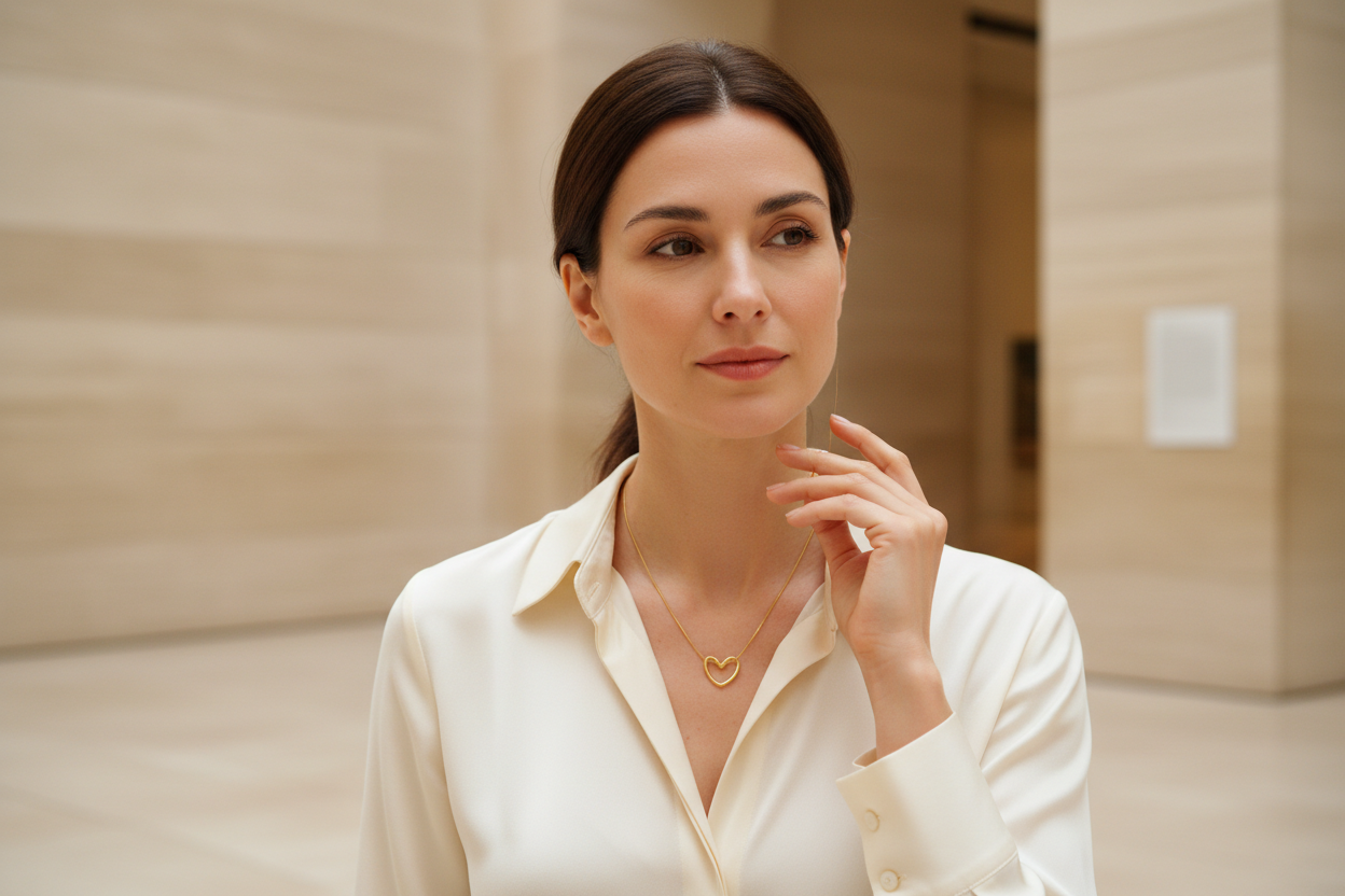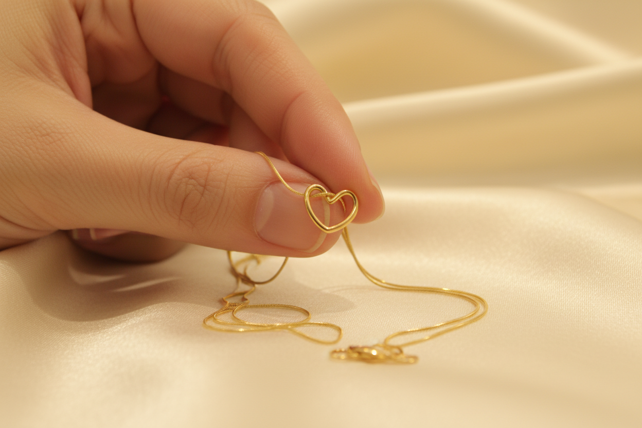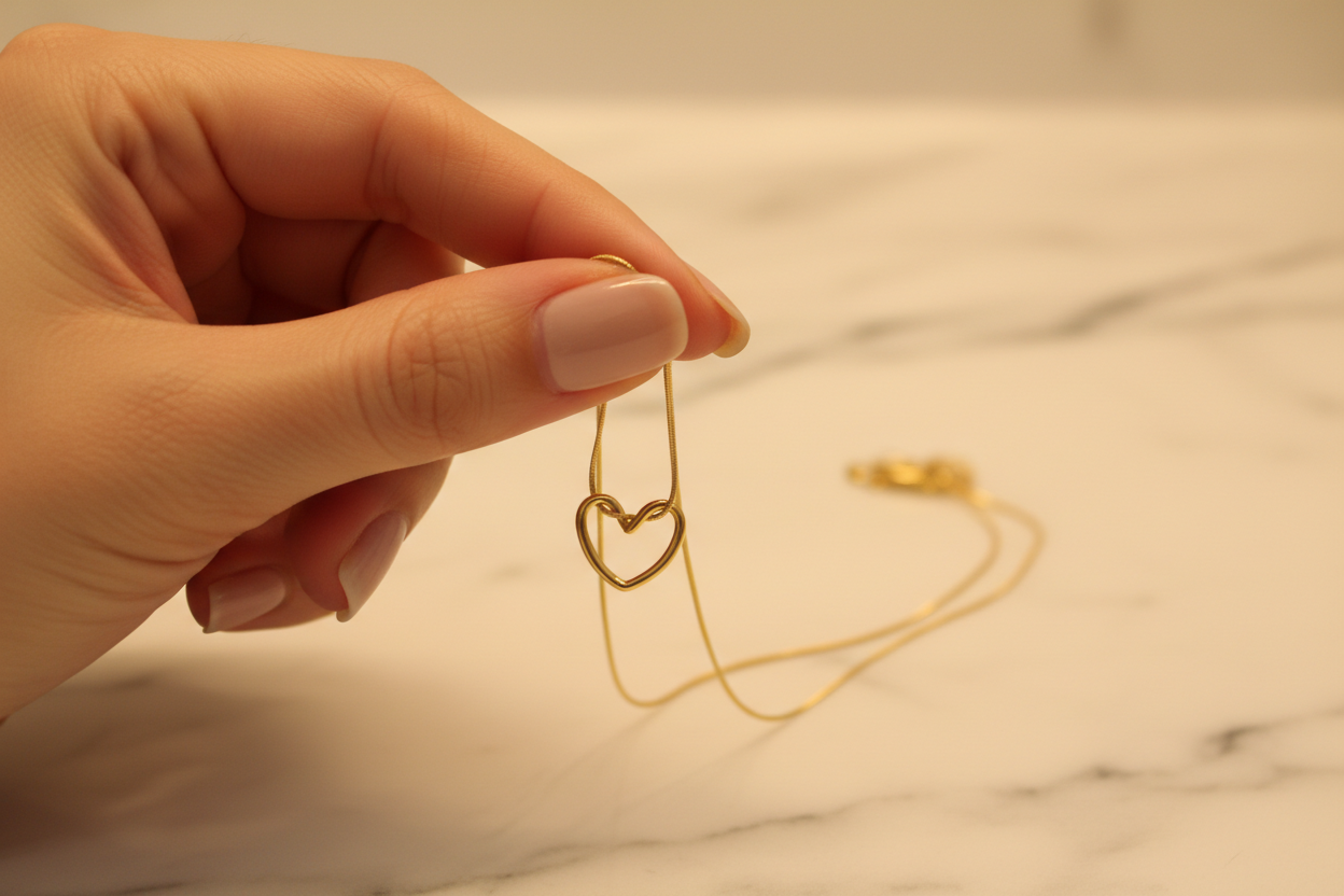 Altın renkli ince zinciri ve modern kalp formu sayesinde günlük kombinlerden