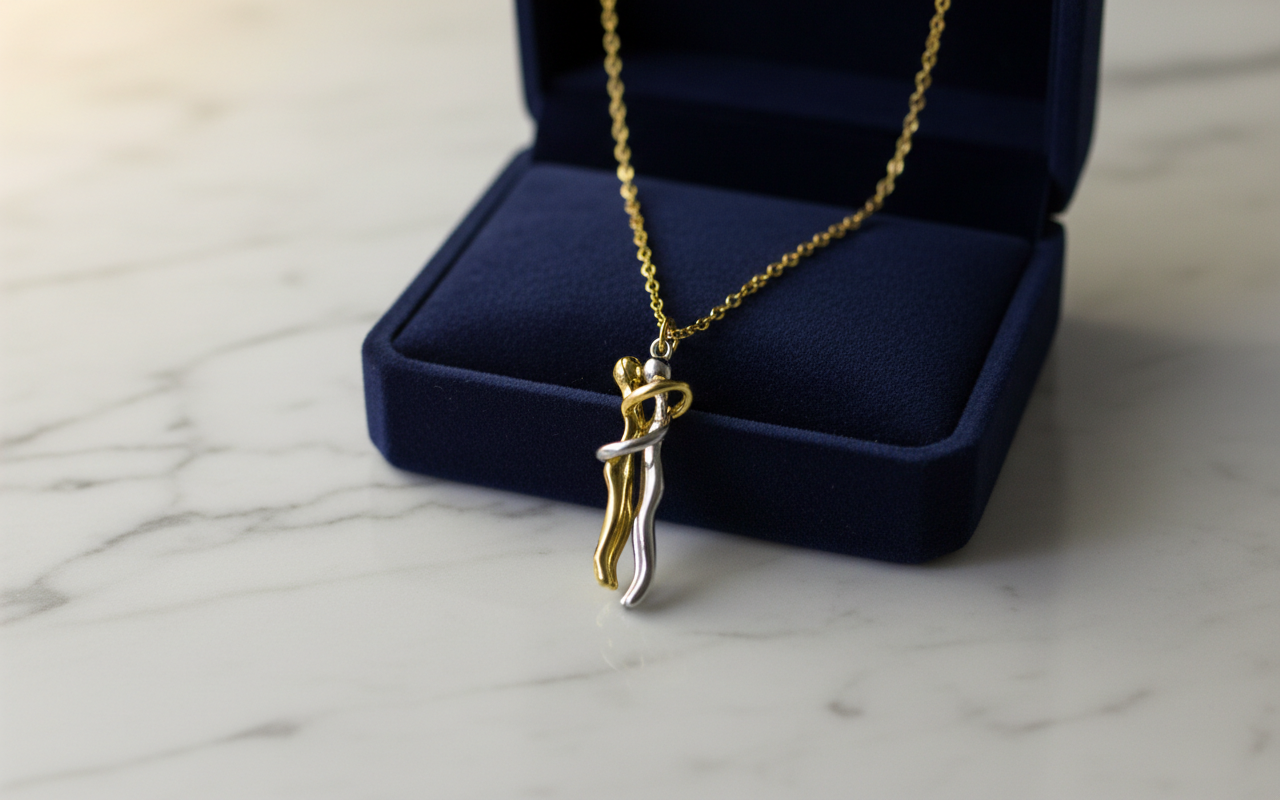 kolye, sevginin en saf halini simgeliyor. Birbirine sıkıca sarılan iki figür,