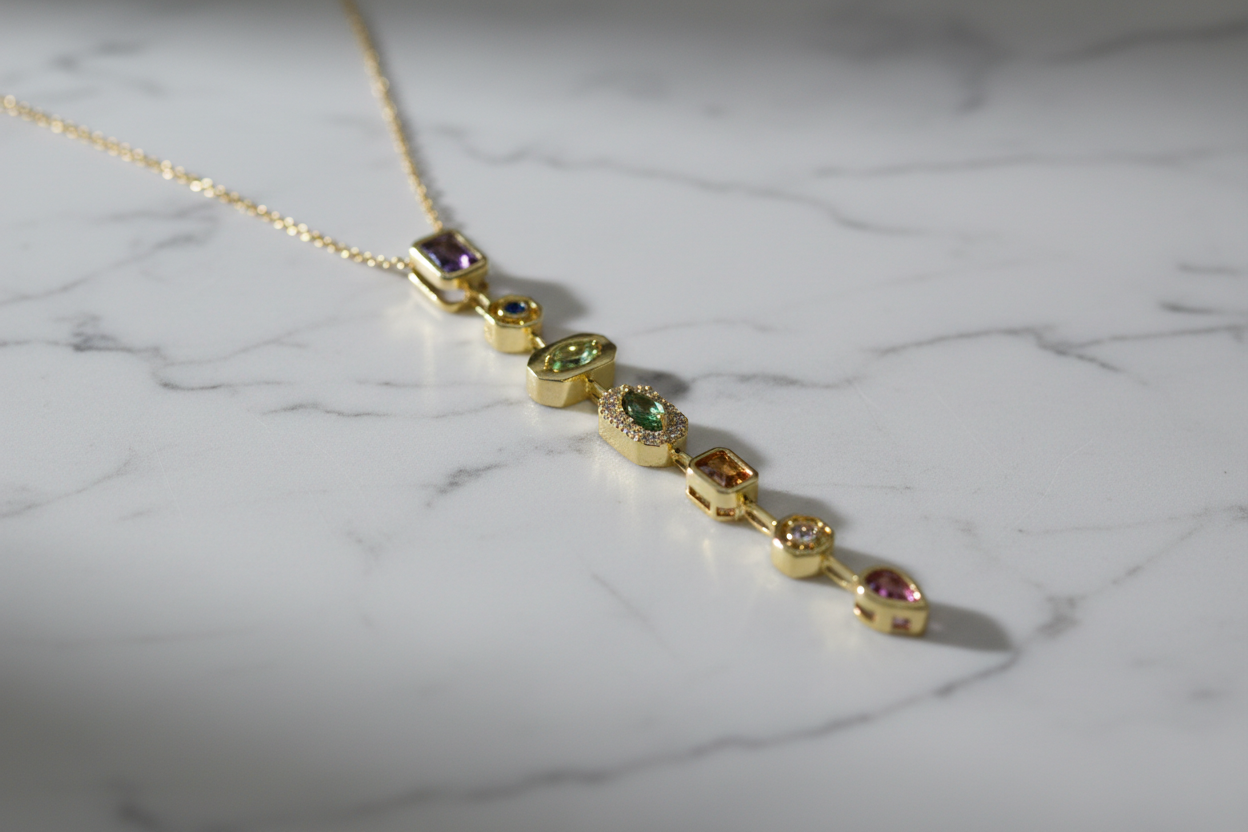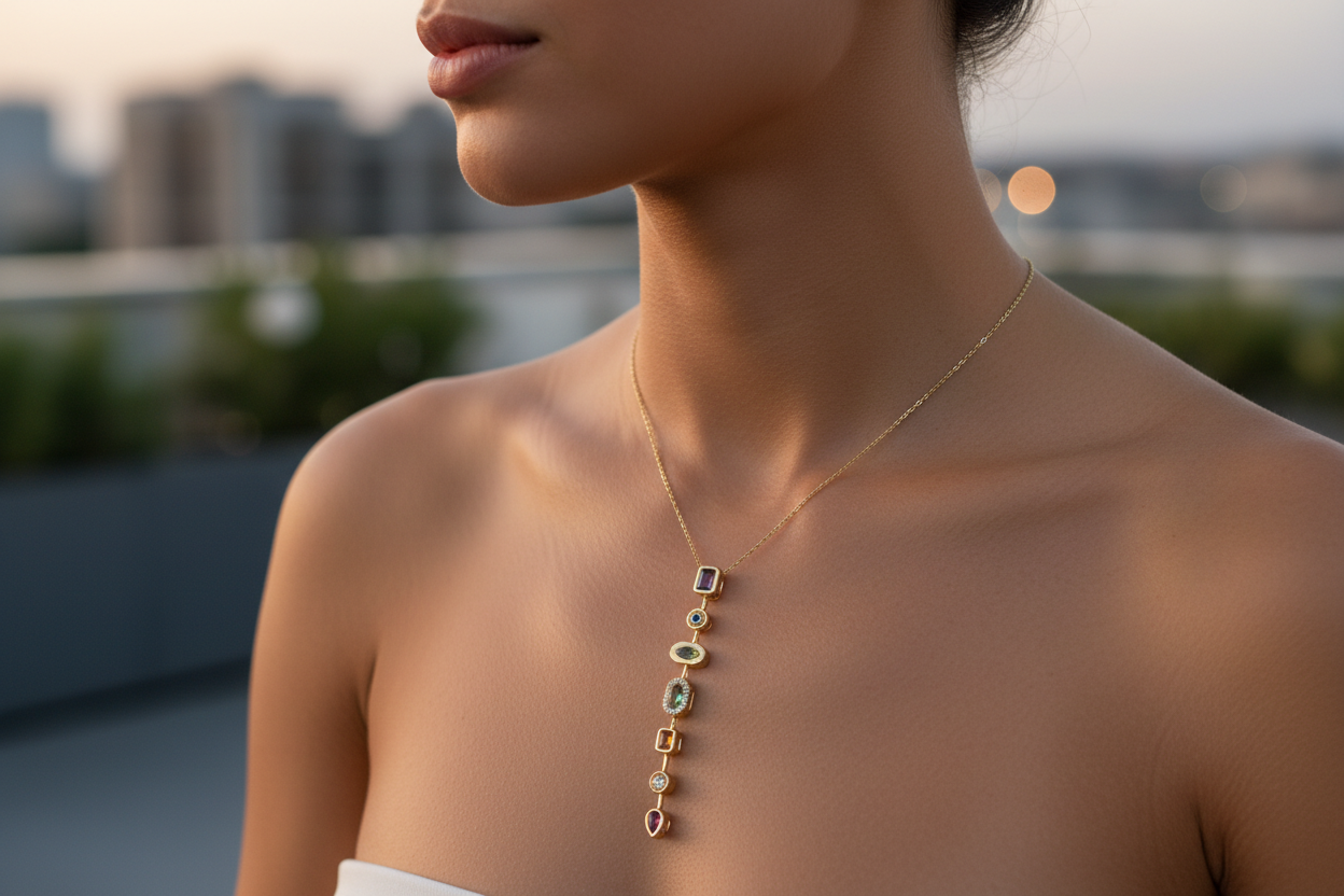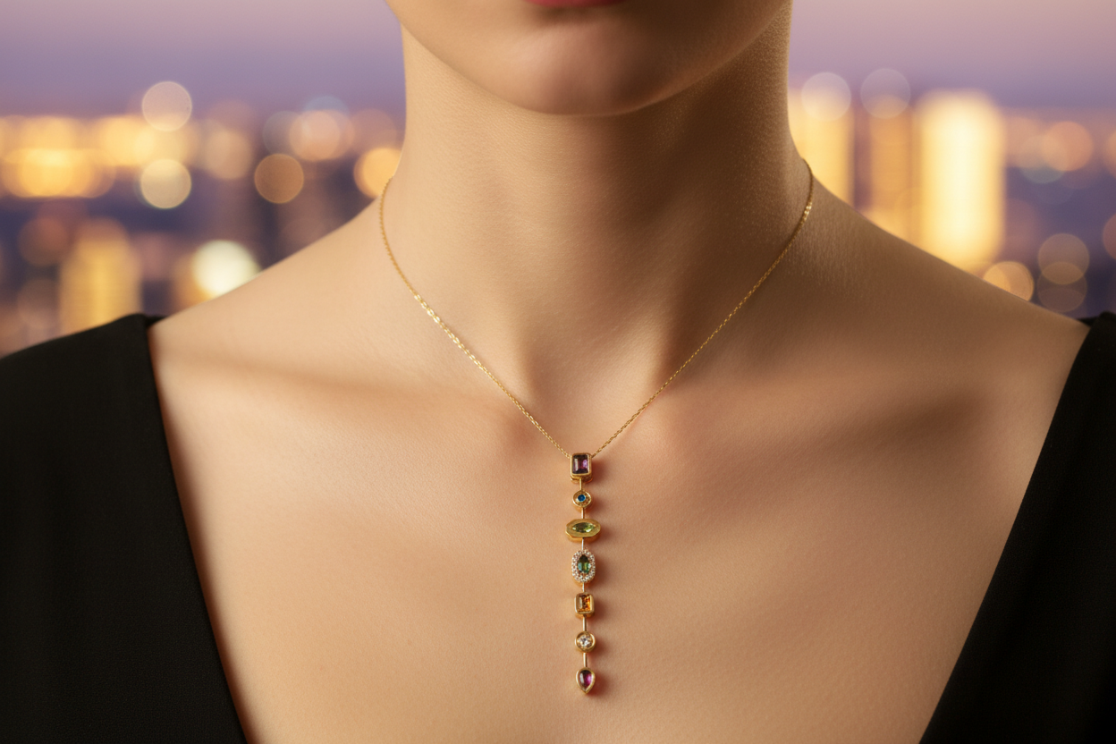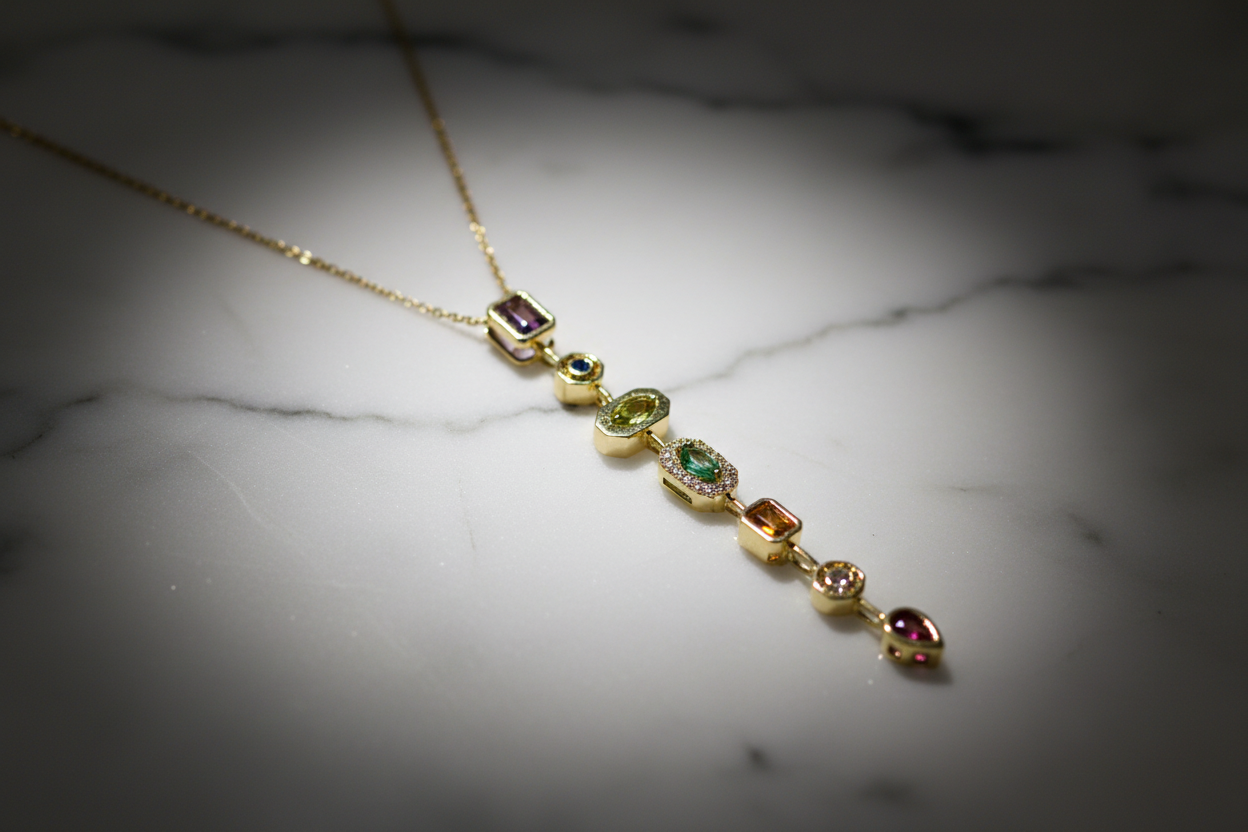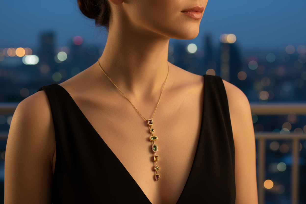 ve formlardaki taşların uyumuyla tasarlanan bu uzun dikey kolye, zarif ve