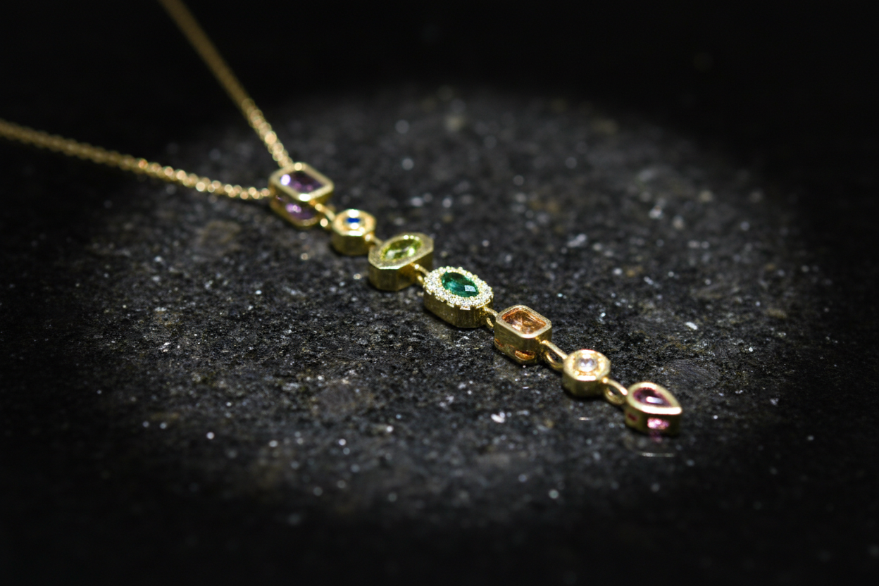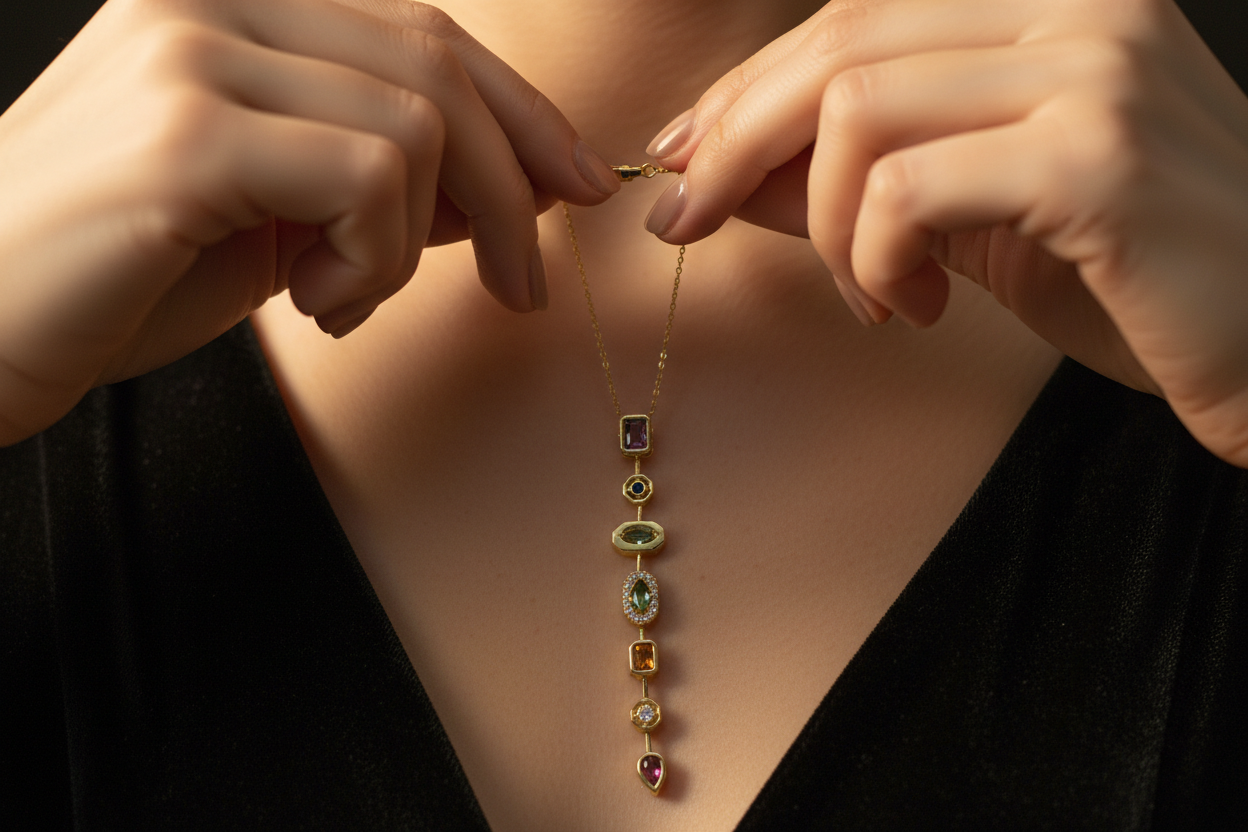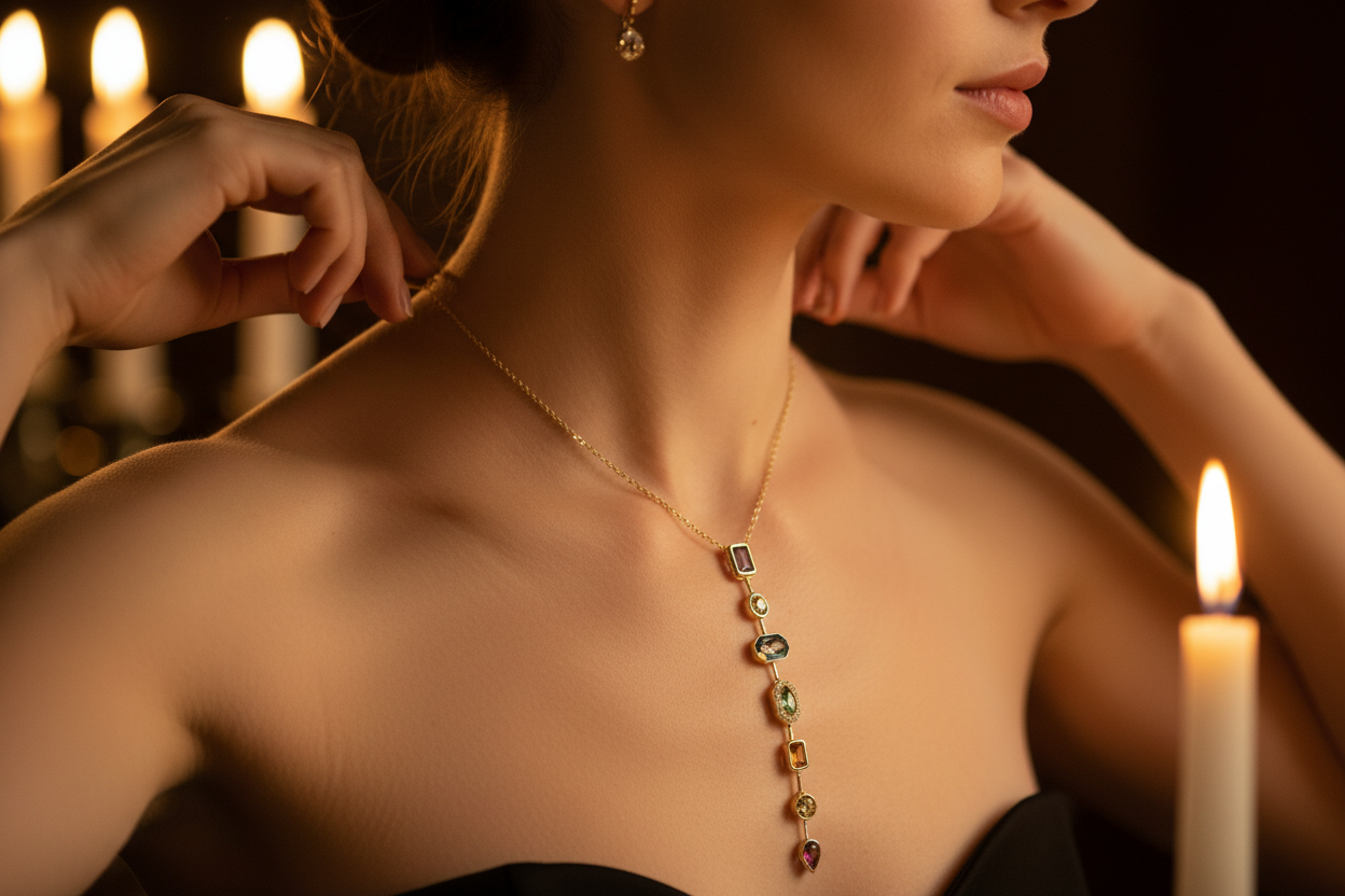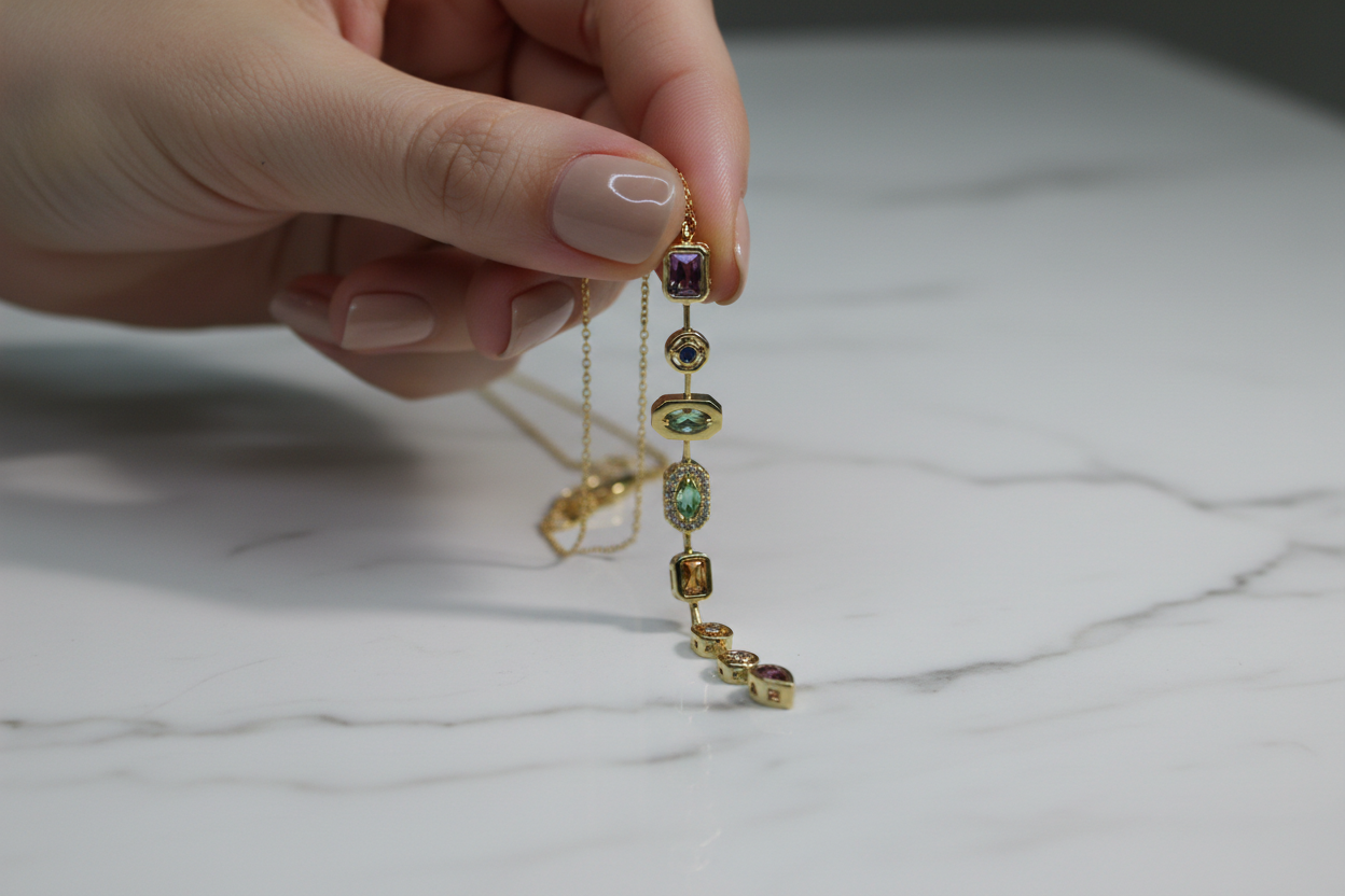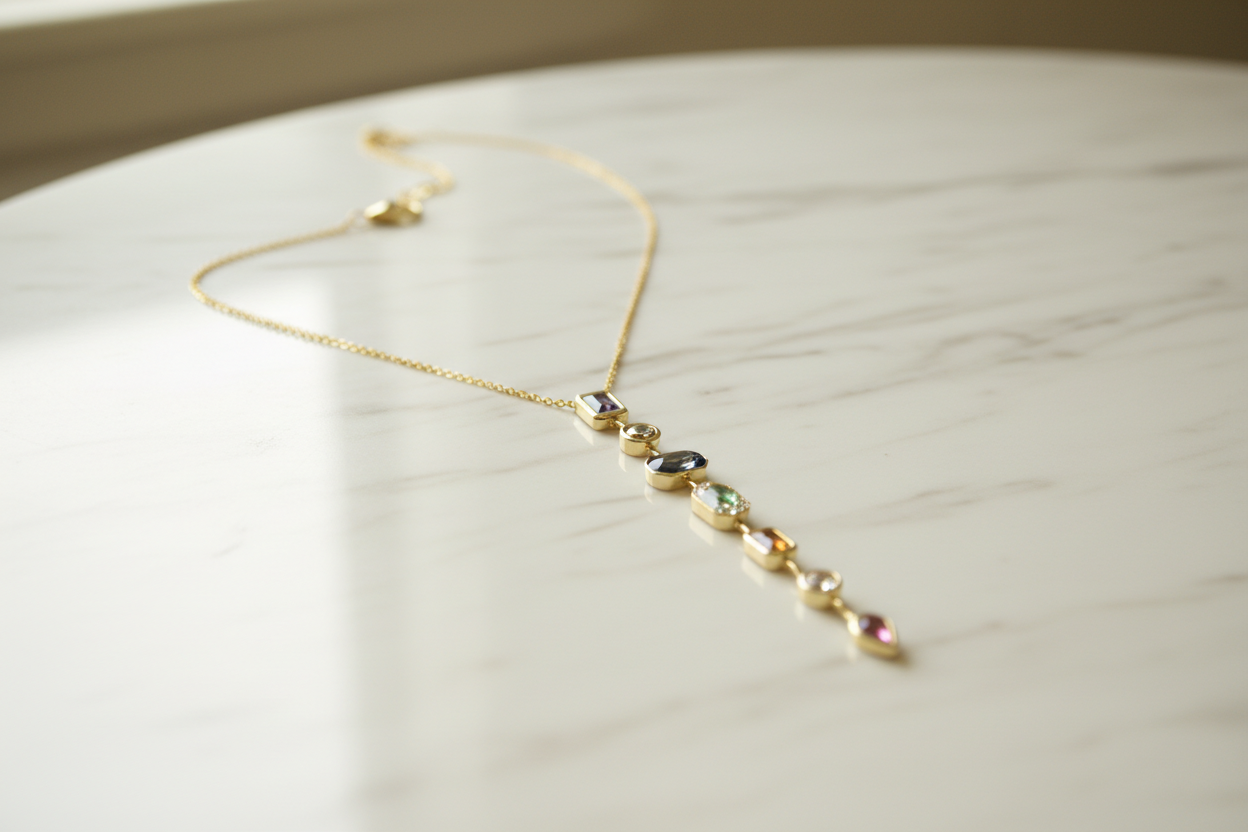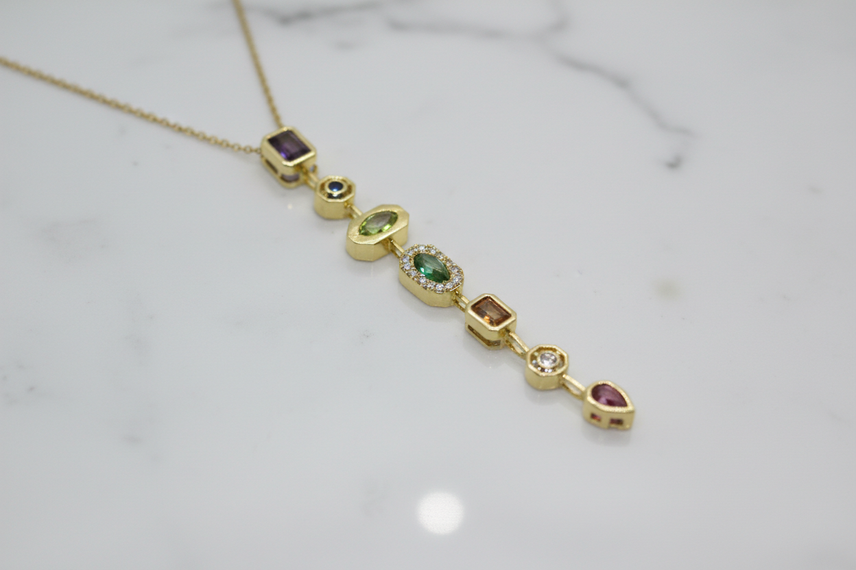 ve formlardaki taşların uyumuyla tasarlanan bu uzun dikey kolye, zarif ve