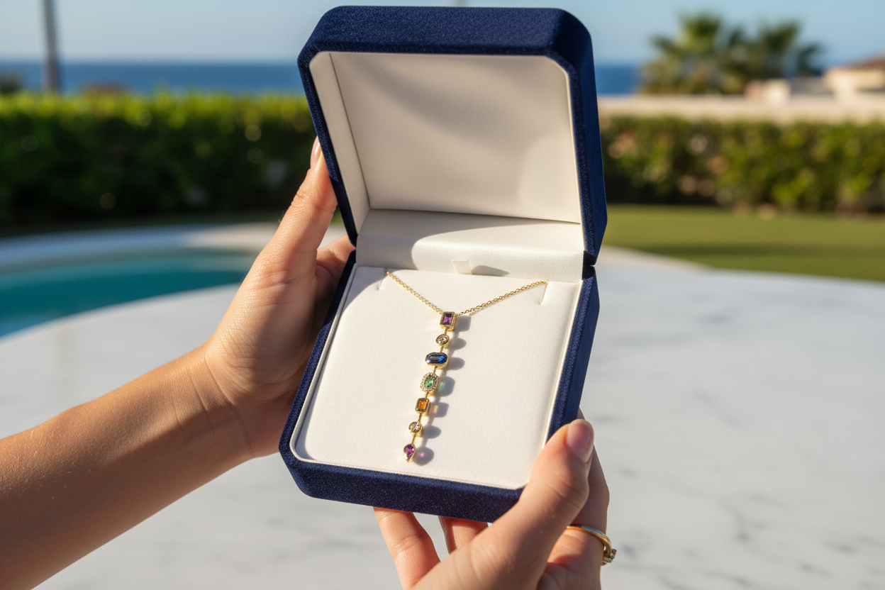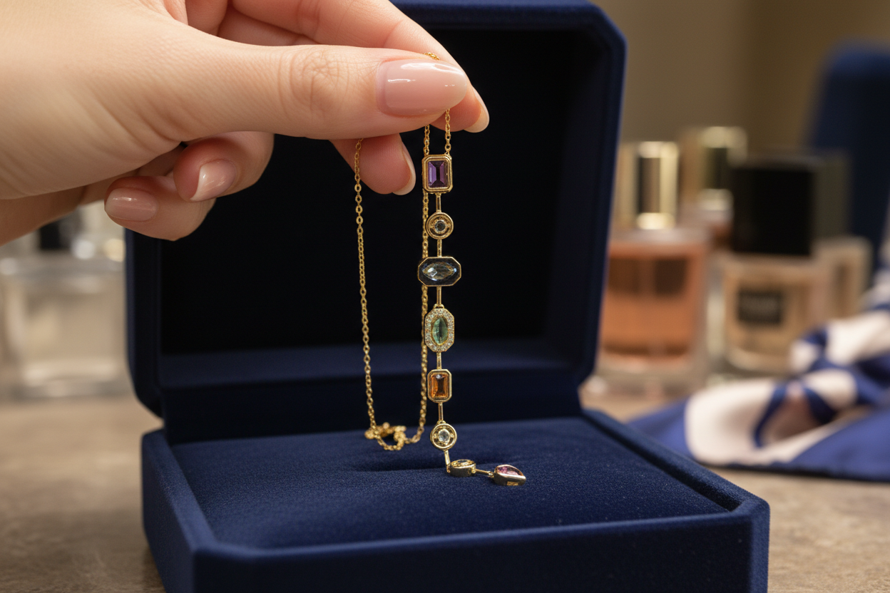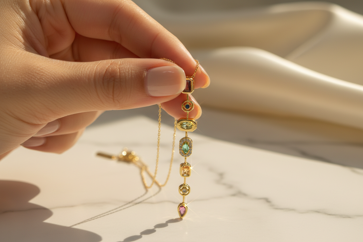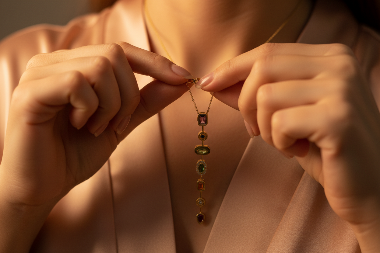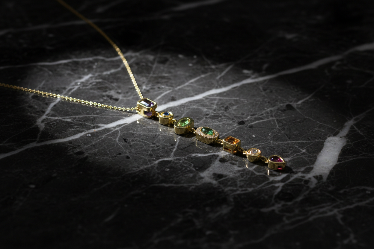 ve formlardaki taşların uyumuyla tasarlanan bu uzun dikey kolye, zarif ve