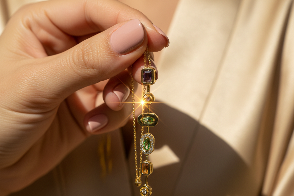 Altın renk kaplaması ve çok taşlı yapısı ile minimal ama dikkat çekici bir